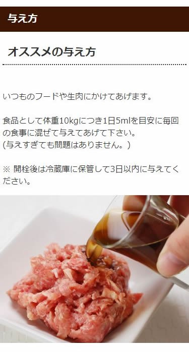 食品として体重10kgにつき1日5ml(1本の半分)を目安に毎回の食事に混ぜて与えてあげてください。