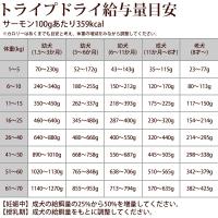 粗タンパク質30.0%以上、粗脂質16.0%以上、粗繊維質4.0%以下、水分10.0%以下、粗灰分7.0%以下、リン0.8%以上、マグネシウム0.10%以下、タウリン2790mg/kg以上、オメガ6 2.3% 以上、オメガ3 1.5% 以上