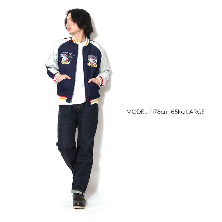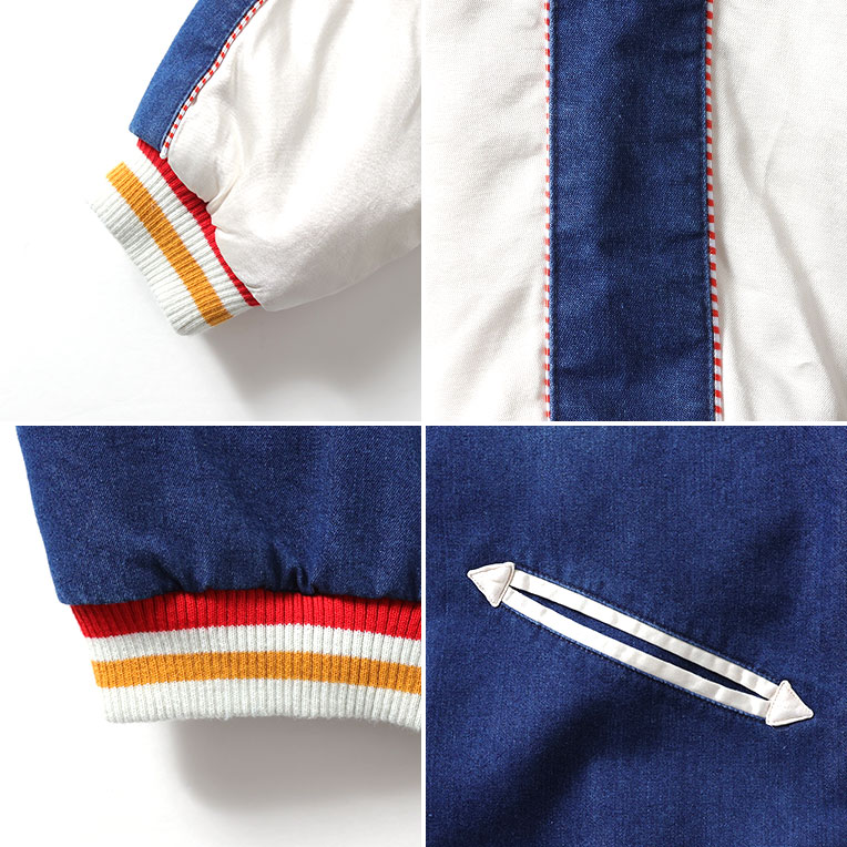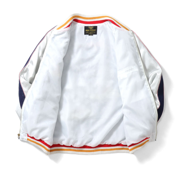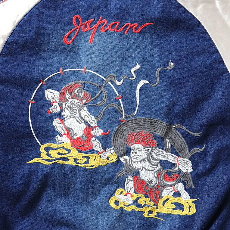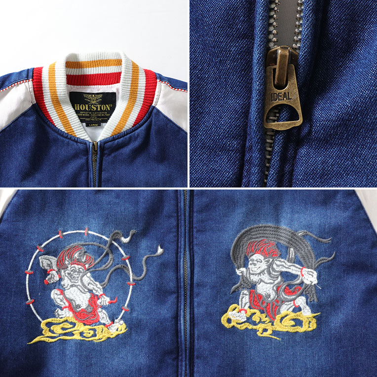 | 商品説明 | HOUSTONらしい変わり種のスカジャン。身頃生地にインディゴナイロンを使用し、その上から風神雷神の刺繍を施している。袖身頃のラインもインディゴナイロンと赤白の鉢巻きパイピングを採用。経年化も楽しめるデニムライクなスカジャンが誕生。 |