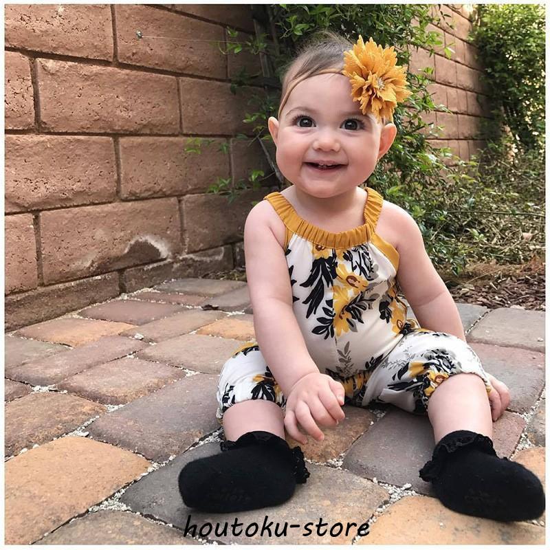 ベビー キッズ つなぎ サロペット ロンパース カバーオール コンビネゾン 花柄 ノースリーブ 肩紐 膝丈 5分丈 7分丈 ボトムス パンツ ライン入