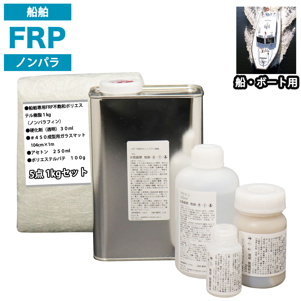 船・ボート専用 FRP補修5点キット 樹脂1kg ノンパラフィン 硬化剤 ガラスマット アセトン パテ付
