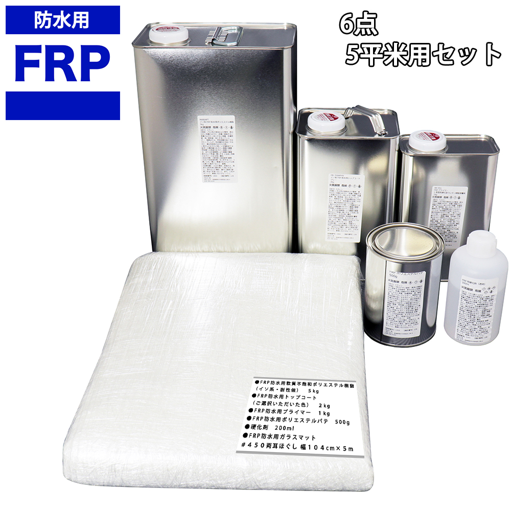 【FRP防水材料6点 キット/5平米用/補修・改修】軟質/イソ系/耐震 FRP樹脂/硬化剤/ガラスマット/ポリパテ/プライマー/トップコート付 セット