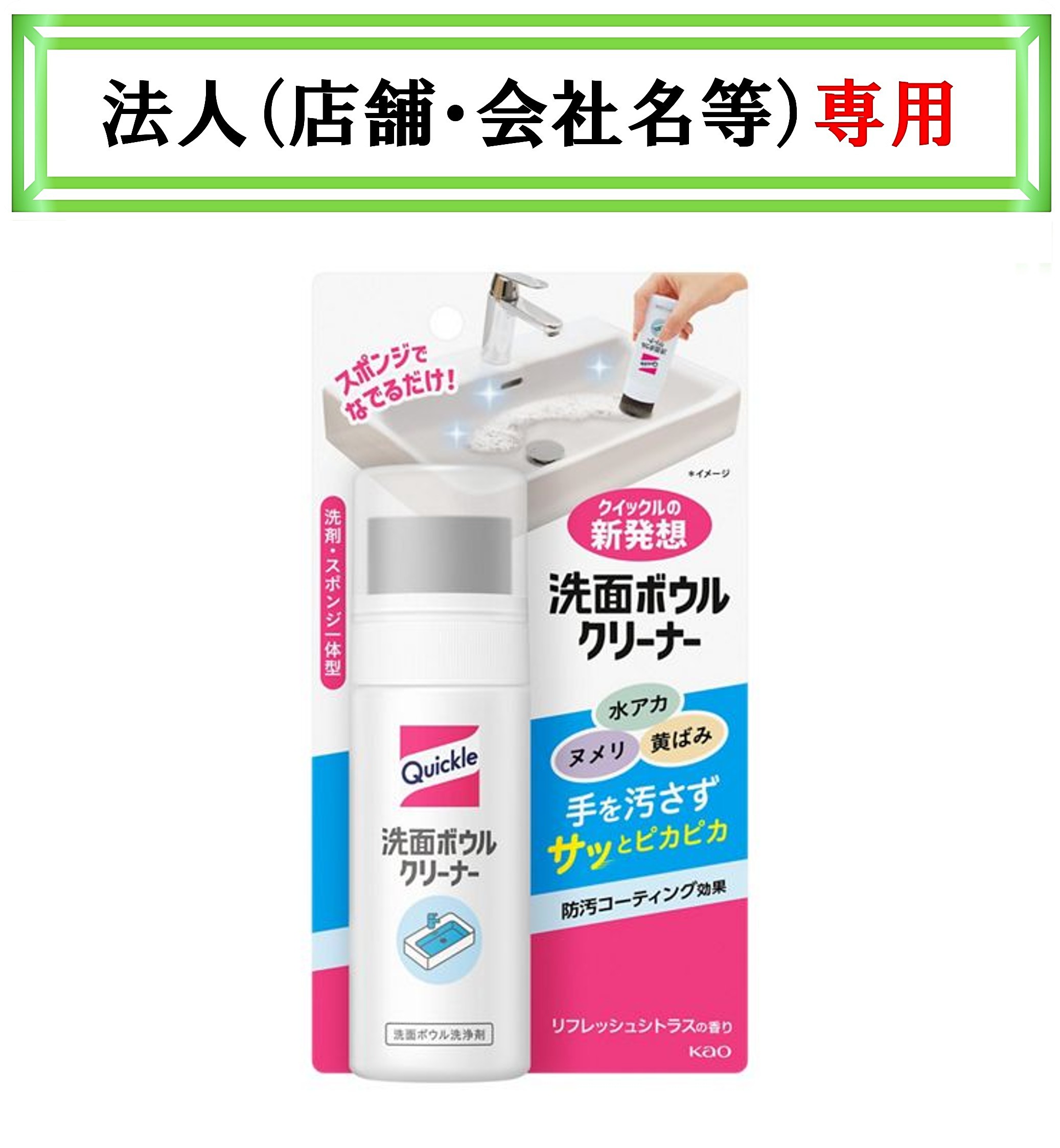 クイックルの新発想!洗剤・スポンジ一体型で洗面ボウル掃除が簡単・気軽に!水アカ、ヌメリ、黄ばみ等、スポンジでなでるだけで手を汚さずサッとピカピカ。防汚コーティング効果でキレイが長続き。・抗菌※スポンジ採用。簡単な手入れでスポンジの清潔が続く・除菌※、消臭、ウイルス除去※* ・リフレッシュシトラスの香り ※すべての菌・ウイルスに効果があるわけではありません *エンベロープタイプ1種類で効果を検証