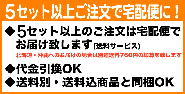 | 〇5セット以上は宅配便にて手配 ※宅配便の場合は他商品と同梱OK、代引&日時指定OK ※メール便の場合お届け日指定不可。 (ポスト投函の為発送日からお届けまで数日(3〜4日目安)かかります) ※メール便の場合ポストに入りきらない場合は不在票が投函されます。 お手数をお掛け致しますがお客様より再配達のご依頼を していただきお受取りくださいませ。 ※宅配便の送料込み商品とご一緒にご注文の場合は宅配便、 同梱にてお届け ※送料別商品とご一緒にご注文の場合は送料760円を加算し 宅配便にてお届け (ヤフーショッピングから注文後に届く自動配信メールでは 送料0円となっておりますが当店にて受付後加算となります) ※お支払い方法にて代金引換を選択された場合、メール便ではなく 宅配便(代金引換)へと注文内容を変更させて頂きます。 その際送料760円を加算し発送の手配 ※メール便の場合北海道沖縄への送料は無料ですが、宅配便の場合は別途送料760円を頂戴致します。 |