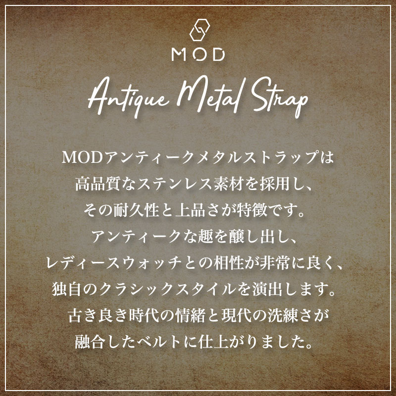 | MOD ”腕元のアップデート”をテーマにスタートした腕時計のカスタムパーツブランド。 MODはMake Only Detectの頭文字とModifyの二つを意味しています。 コンセプトに掲げるのは三つ 創造(Make) メーカーのラインナップにはない新たなプロダクトを創造 特別(Only) 人とかぶらない自分だけの特別な腕時計 発見(Detect) お手持ちの腕時計の新たな一面を発見 MODはエッジの効いた独自の感性で今までの市場にはなかった新たなプロダクトを創造していき、腕時計の楽しみ方を再定義します。 [MOD ANTIQUE METAL STRAP/アンティークメタルストラップ] MODアンティークメタルストラップは高品質なステンレス素材を採用し、その耐久性と上品さが特徴です。アンティークな趣を醸し出し、レディースウォッチとの相性が非常に良く、独自のクラシックスタイルを演出します。古き良き時代の情緒と現代の洗練さが融合したベルトに仕上がりました。 |