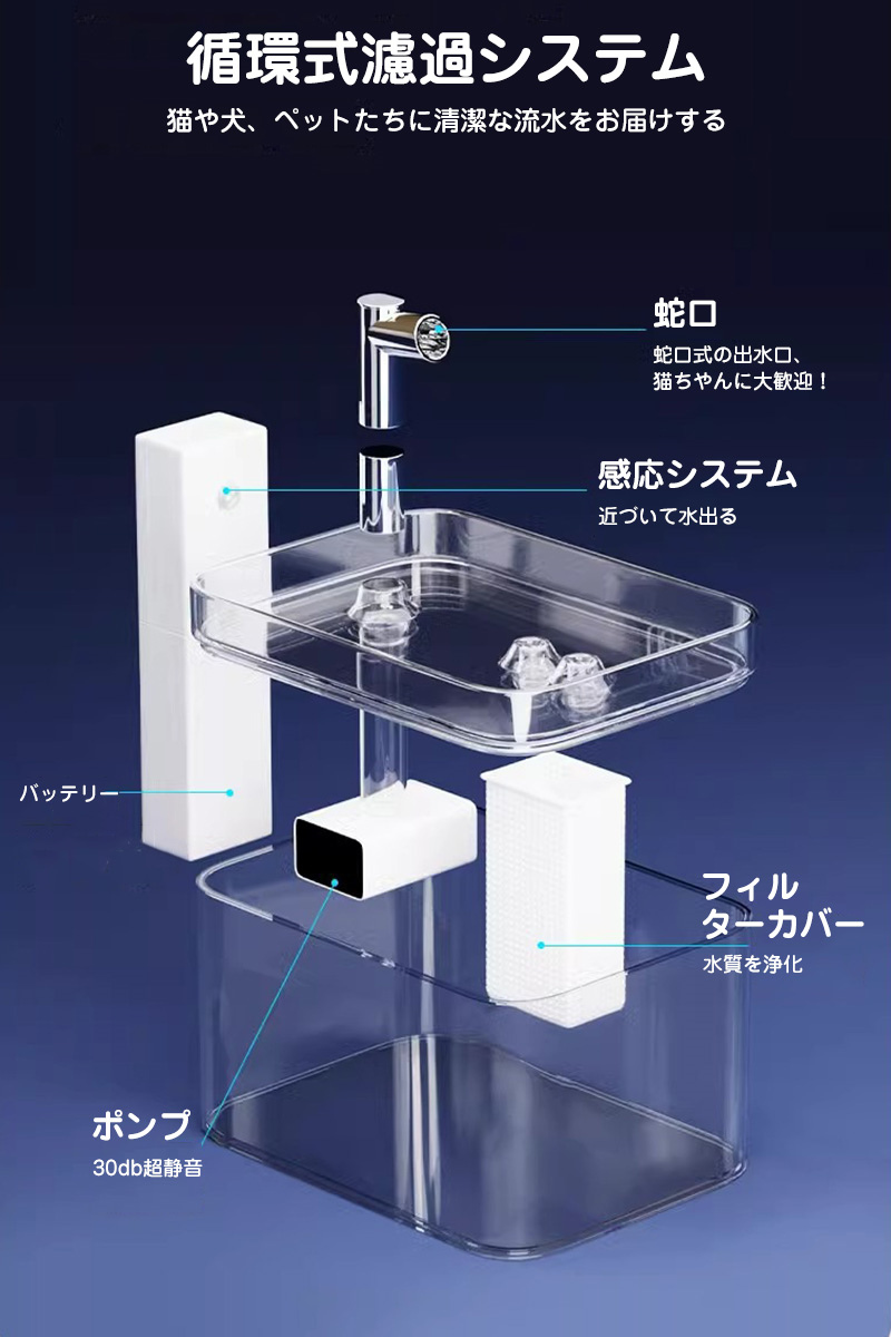 送料無料 猫犬用循環浄水給水器 自動給水器 ペット 給水器 USB充電 ウォーターディスペンサー 蛇口式 循環式 浄水 自動水やり器 犬猫水飲み器 留守番