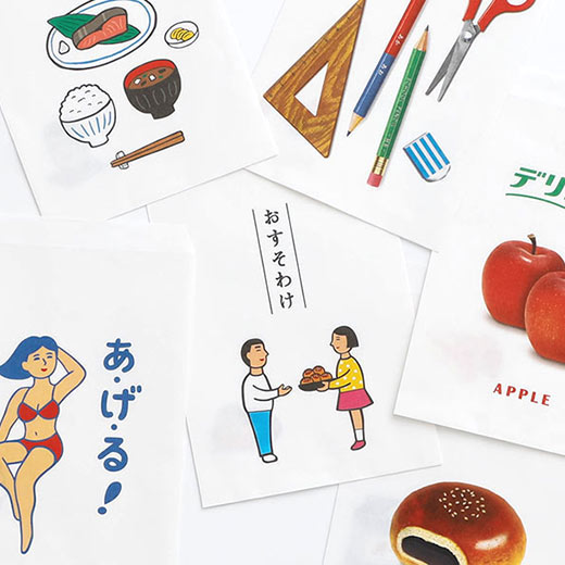 お土産やちょっとした贈り物など、気軽に使えるお裾分け袋。表面がツルツルで内側はザラザラ、中身がうっすらと透ける薄手の平袋です。使い勝手のいいA6サイズで、大人数に配るときにも重宝します。用途に合わせて色々な柄をご用意ください。