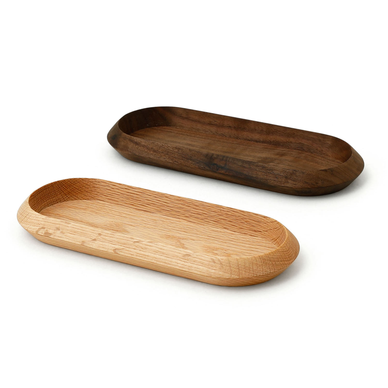 1枚木から削り出して作られた木製のトレイです。サイドの形状が特徴的で、シンプルでありながら上品な印象に仕上がりました。オーバルタイプは小物の整理にはもちろん、ペントレーやアクセサリートレーとして使ったり、メガネの定位置として使うのもおすすめ。細長い形状なのでPCモニター下にもスマートに収まります。木材はオークとウォールナットの2種類。天然木を使用しているため、1点1点木目や色味などが異なり、愛着を持ってご使用いただけます。使い込むことで風合いの変化を楽しむことができるオイル塗装仕上げです。