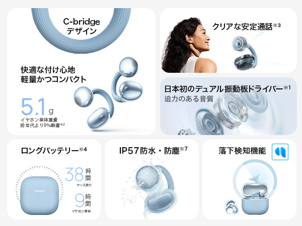 FreeClip 2はBluetooth 6.0を搭載し、Android、iOS、Windowsデバイスのいずれにもペアリングして使用することができます。HUAWEI Audio connectアプリをダウンロードすれば、ジェスチャー操作やサウンド効果の設定もカスタマイズできます。