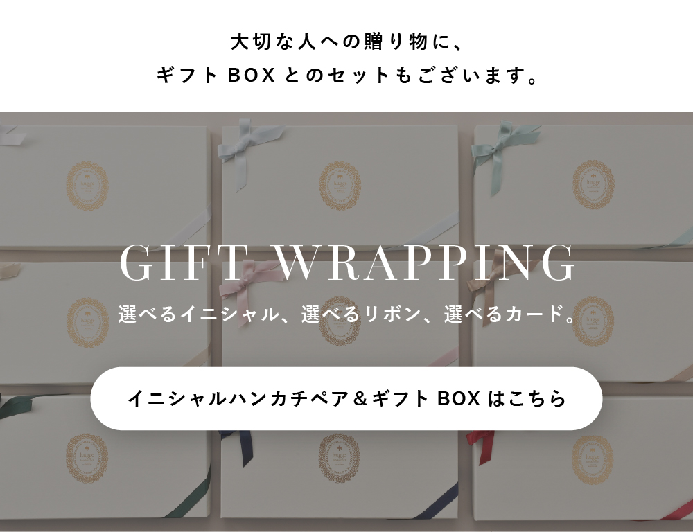 シリーズの中でも人気の「レースハンカチ」「ノンレースハンカチ」に、お好みのイニシャルモチーフを施した特別なペアを、セットでお届けいたします。