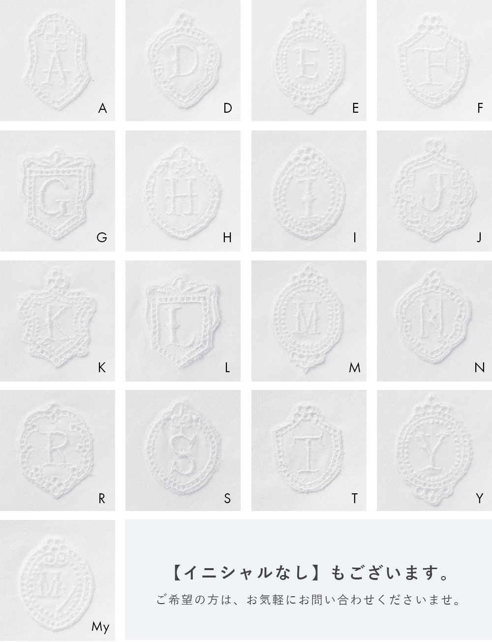 イニシャル刺繍は17文字から選べます。