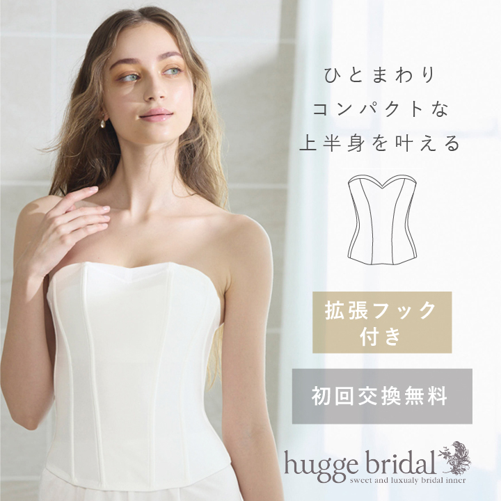 ![]() ブライダルインナーの定番ともいえるビスチェの特徴は、ブラ、ウエストニッパーが一体型になっていること。 1枚のインナーでバスト・ウエストをトータルに補正して、メリハリのある上半身をスタイリングします。 一体型だから、インナーのラインや段差も気にならない。 バストからウエストまでを1枚でサポートできるから、インナーの重なりや厚みも目立たず、フラットなインナーシルエット。 薄手のドレスでもつるり滑らかな装いに。 ![]() ![]() ※カップサイズ関係なくって…? バスト内側は、従来のブラジャーのパターンではなく、パネルで高さを抑えてすっきり整える構造。バストを圧迫することなく、自然にボリュームを分散させます。 また、アンダー部分にワイヤーがないため、ワイヤーによる締め付けや食い込みが苦手な方におすすめ。 長時間の着用でもお身体に負担がかかりにくく、快適な着け心地です。 ![]() 大きなバストをすっきりさせる構造のため、普段のブラジャーのサイズがCカップ以上の方におすすめします。 | ||||