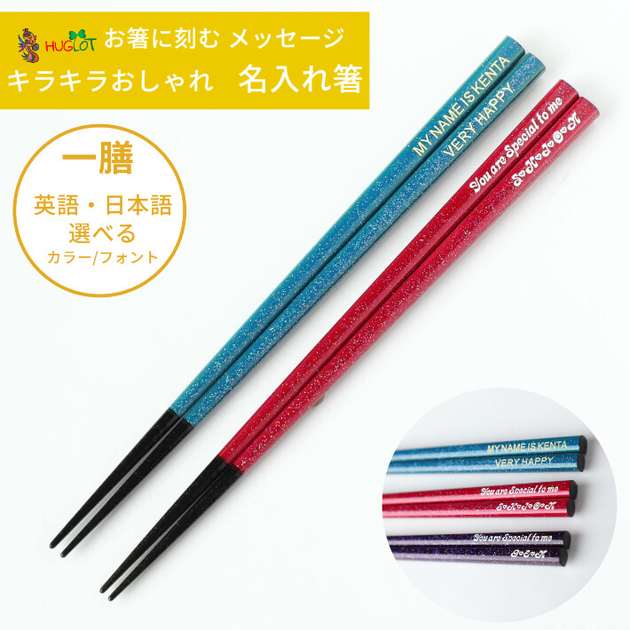 | 商品の特徴 | キラキラ・ラメのかわいいお箸です。 華やかで豪華です。 メッセージが映えるので、日本語・英語、フォントで自在にアレンジ。 ・誕生日、記念日、イベントや景品に選ばれています。・名入れ、メッセージ無料です!家族や友人へ贈り物に人気の商品です。 ・サイズ:23cm(ブルー・レッド・パープル) ・材質:天然木 ・原産国:日本 こちらは「箸 一膳」のご注文ページです。「袋包装」 または「 紙箱入り(有料)」を選んでいただけます。 |