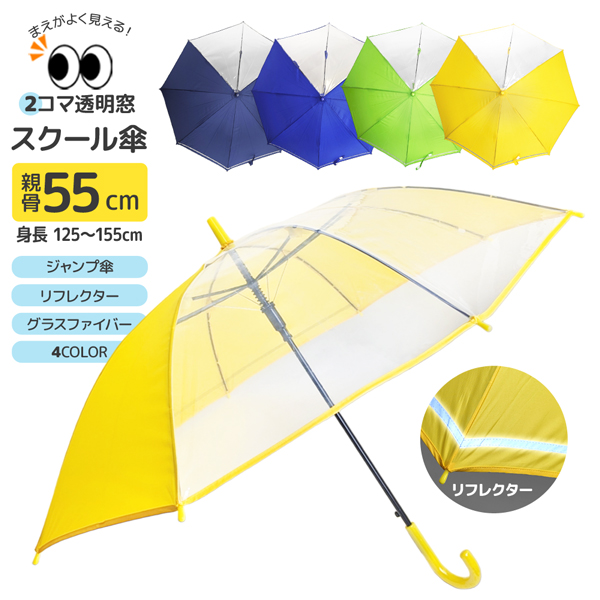 スクール傘 透明窓 2コマ 反射帯つき 無地 55cm ジャンプ 傘 子供傘 学童傘 こども傘 キッズ キッズ傘 ジュニア 男の子 黄色 通学 小学生 55センチ 120cm 130cm
