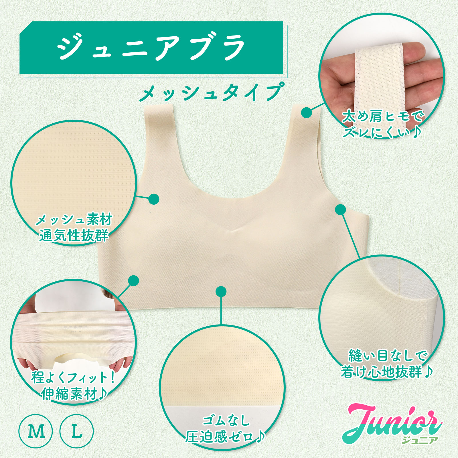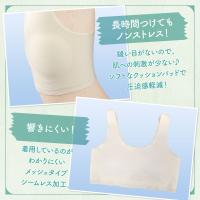 | おすすめ ポイント | ■アウターに響きにくいメッシュタイプのシームレスブラ。 ■快適な着心地で、肌への摩擦や刺激が少なく、肌に優しい。 ■サラサラとした、着心地の良いストレッチ性のある生地。 ■肩紐が広く、安定しているからずれおちにくい! ■縫い付けカップで動いてもズレにくく安心して着用できます。 洗濯しても型崩れしにくい&パッドが飛び出ない! ■ファーストブラとしても最適です♪ |