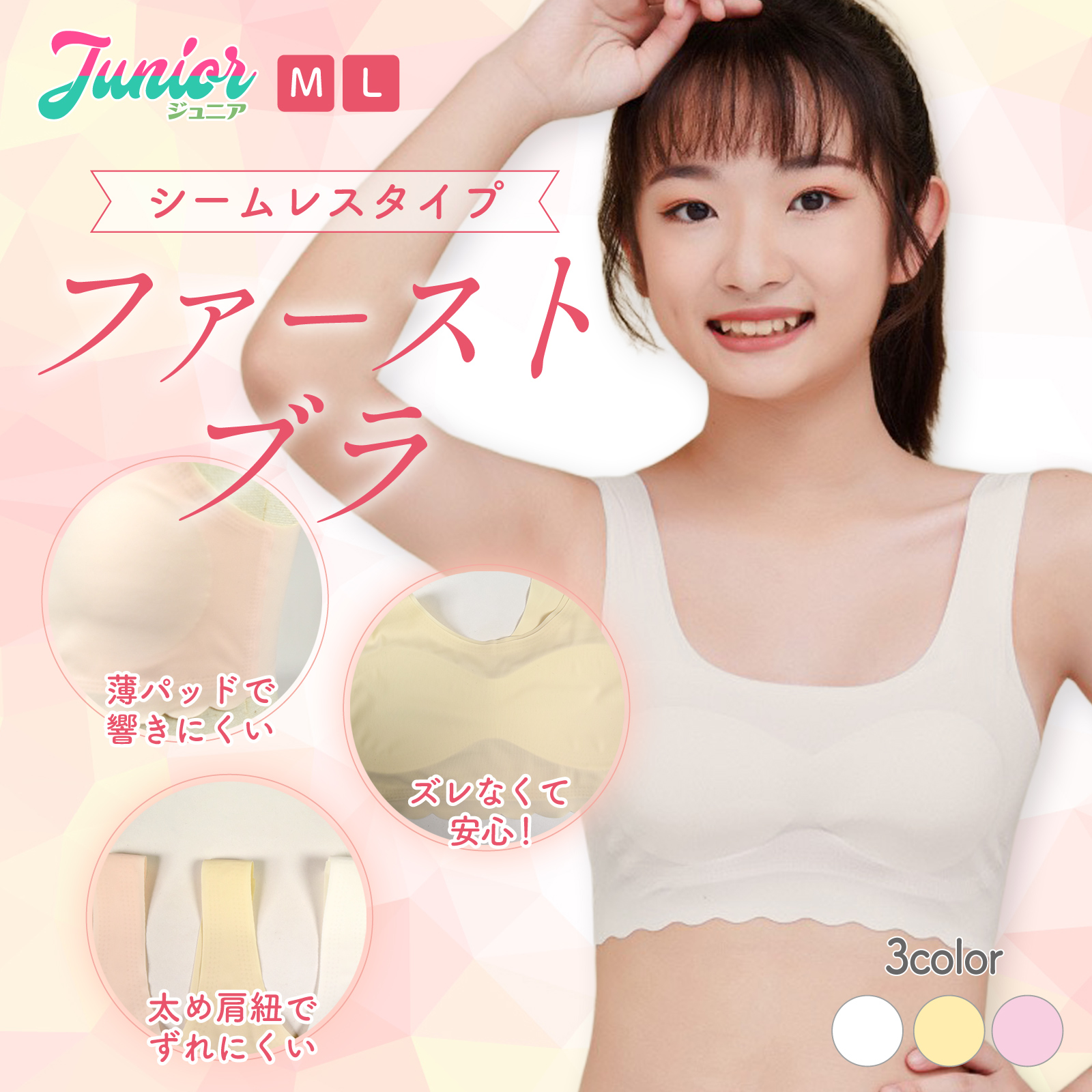 | おすすめ ポイント | ■アウターに響きにくいシームレスブラ。 ■快適な着心地で、肌への摩擦や刺激が少なく、肌に優しい。 ■サラサラとした、着心地の良いストレッチ性のある生地。 ■肩紐が広く、安定しているからずれおちにくい! ■縫い付けカップで動いてもズレにくく安心して着用できます。 洗濯しても型崩れしにくい&パッドが飛び出ない! ■ファーストブラとしても最適です♪ |
