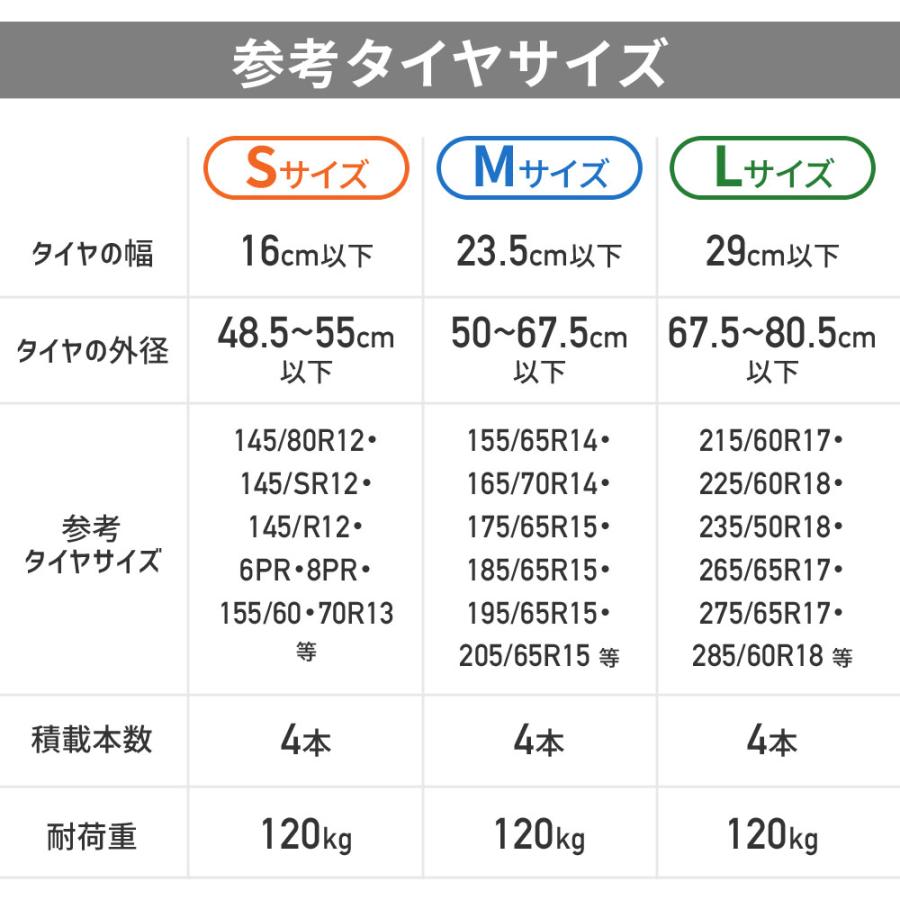 | ※タイヤラックとカバーそれぞれ単品でのご注文となります※ ---タイヤ収納ラック--- 【特徴】 ●様々なサイズに対応 タイヤが1台分(4本)収納できます。 上下2段にタイヤをスッキリ収納する ことができるタイヤラックです。 軽自動車、軽貨物車用、普通自動車、RV車用など ●しっかりとした作り シッカリした作りで安定してタイヤが保管できます。 ●ステンレスクラッド使用 丈夫でサビにくくなっています。 【商品詳細】 【Sサイズ】 ■参考タイヤサイズ 145/80R12・145/SR12 145/R12・6PR・8PR 155/60〜70R13等 ※記載されていない場合は下記の寸法をご確認ください。 ■タイヤの幅:16cm以下 ■外径:48.5〜55cm以下 ■商品サイズ:(約)幅47×奥行31×高さ114.5cm ■本体重量:(約)3kg ■耐荷重:(約)120kg ■素材:ステンレスクラッドφ25.4MM/厚:0.6MM ■部品:PP樹脂 ■積載仕様:4本 【Mサイズ】 ■参考タイヤサイズ 155/65R14・165/70R14 175/65R15・185/65R15 195/65R15・205/65R15等 ※記載されていない場合は下記の寸法をご確認ください。 ■タイヤの幅:23.5cm以下 ■外径:50〜67.5cm以下 ■商品サイズ:(約)幅61×奥行37×高さ131.5cm ■本体重量:(約)3.2kg ■耐荷重:(約)120kg ■素材:ステンレスクラッドφ25.4MM/厚:0.6MM ■部品:PP樹脂 ■積載仕様:4本 【Lサイズ】 ■参考タイヤサイズ 215/60R17・225/60R18 235/50R18・265/65R17 275/65R17・285/60R18等 ※記載されていない場合は下記の寸法をご確認ください。 ■タイヤの幅:29cm以下 ■外径:67.5〜80.5cm以下 ■商品サイズ:(約)幅73×奥行46×高さ148.5cm ■本体重量:(約)4kg ■耐荷重:(約)120kg ■素材:ステンレスクラッドφ25.4MM/厚:0.6MM ■部品:PP樹脂 ■積載仕様:4本 --- タイヤ収納ラックカバー--- 【Sサイズ】 軽自動車、軽貨物車用のタイヤラックカバー 10〜13インチのタイヤサイズが目安になります。 【Mサイズ】 普通自動車用のタイヤラックカバー 13〜15インチのタイヤサイズが目安になります。 【Lサイズ】 RV車など大型自動車用のタイヤラックカバー 16〜18インチのタイヤサイズが目安になります。 【特徴】 ●汎用タイプのカバー 本ページタイヤラックのみならず、サイズが合っていれば 他の商品でもカバーすることが可能です。 ●水をはじきやすいフッ素撥水加工 フッ素撥水加工が施してあるので、水を弾いたり耐熱性に優れています。 ポリエステル素材なので水に濡れても乾きやすくなっています。 このカバーをかけることで雨や紫外線、砂ぼこりから タイヤを守ることができます。 ●ひも止め付でしっかりカバー ワンタッチですそ周りを収縮できるひも止め付きです。 風などでのばたつきや、砂ぼこりを防ぐことができます。 【商品詳細】 ■サイズ(約) S:(約)47×60×123cm M:(約)61×72×145cm L:(約)71×87×170cm ■重量(約) S:0.2kg M:0.24kg L:0.36kg ■素材:本体/ポリエステル、ひも/ポリプロピン ■加工方法:フッ素撥水加工 |