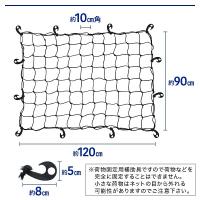 伸縮率1.5倍の良く伸びるゴムと約10cmのマス目のネット、付属の12個のフックで荷物をしっかり固定します。