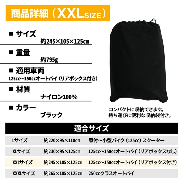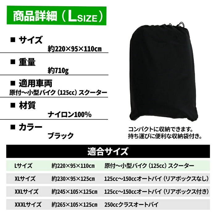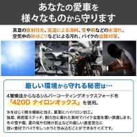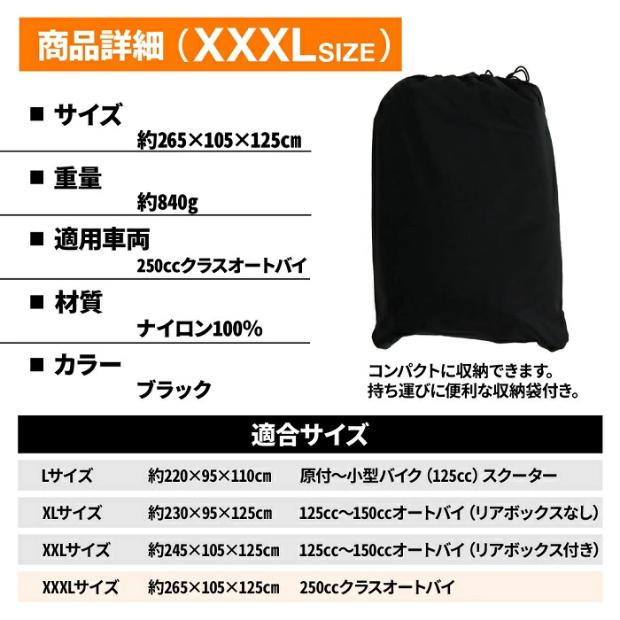 | 真夏の直射日光、高温による消耗や雪や雨などの水濡れ 空気中の砂ぼこりなどによる汚れ、バイクの盗難 そんな厳しい環境から守れる秘密は、 従来のオックスフォード素材よりも優れた、 4層構造からなる極薄の耐放射線性生地 「420D ナイロンオックス」を採用をしていること。 水をはじく撥水機能に加え、裏面にハイパロン加工(防水)を 施すことによって、ハリ感と高度な防水性を保ち 強度、高密度ステッチ、耐久性に優れた素材でバイク全面を覆い保護します。 冬の雪や霜、夏の埃や日焼け防止などの厳しい温度変化に強い素材で バイクをしっかりと包み込むことができます。 大きな温度差の変化に適応し、 防雨、防塵、日焼け止めなどからなるバイクの劣化を防止します! 【特徴】 ロックワイヤー用 大口径3.8mmのホール付き ワンタッチベルト付き 持ち運びに便利な収納袋付き 【商品詳細】 ■サイズ L:約265×105×125cm XL:約230×95×125cm XXL:約245×105×125cm XXXL:約265×105×125cm ■重量 L:約710g XL:約720g XXL:約795g XXXL:約840g ■材質:ナイロン100% ■カラー:ブラック 【対応車種】 L:原付〜小型バイク(125cc) XL:125cc〜150ccオートバイ(リアボックスなし) XXL:125cc〜150ccオートバイ(リアボックス付き) XXXL:250ccオートバイ |