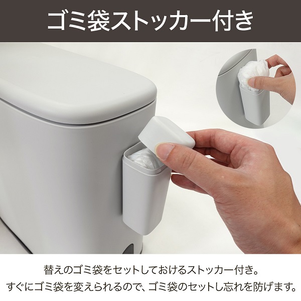 【ゴミ袋ストッカー付き】 替えのゴミ袋をセットしておけるストッカー付き。 すぐにゴミ袋を変えられるので、ゴミ袋のセットし忘れを防げます。