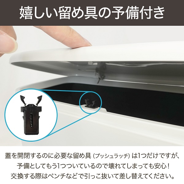 【嬉しい留め具の予備付き】 蓋を開閉するのに必要な留め具(プッシュラッチ)は1つだけですが、 予備としてもう1つついているので壊れてしまっても安心! 交換する際はペンチなどで引っこ抜いて差し替えてください。
