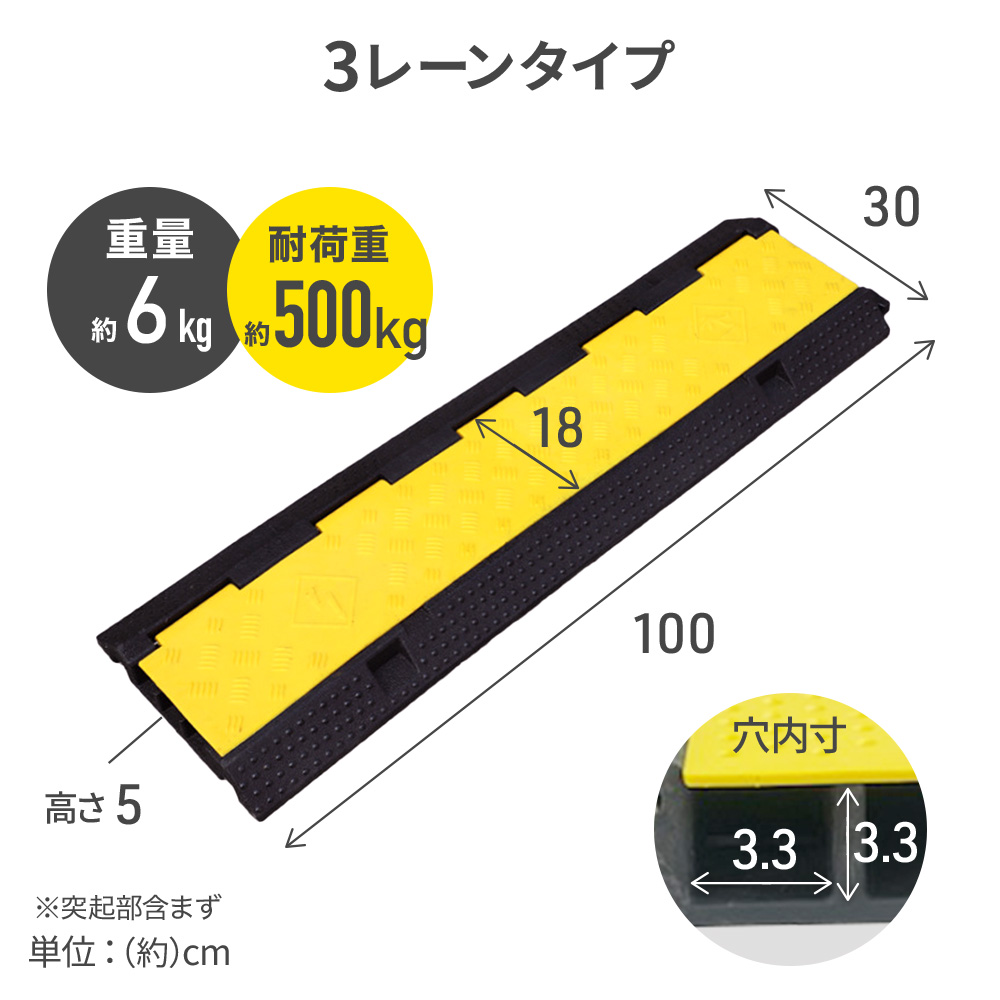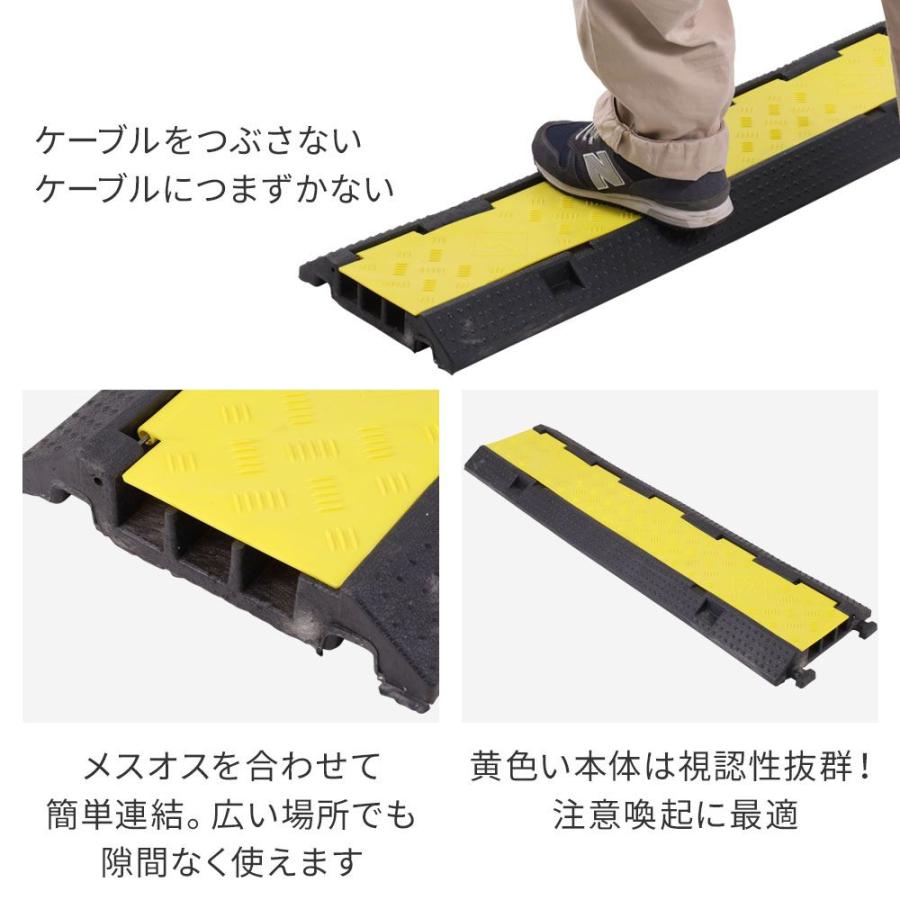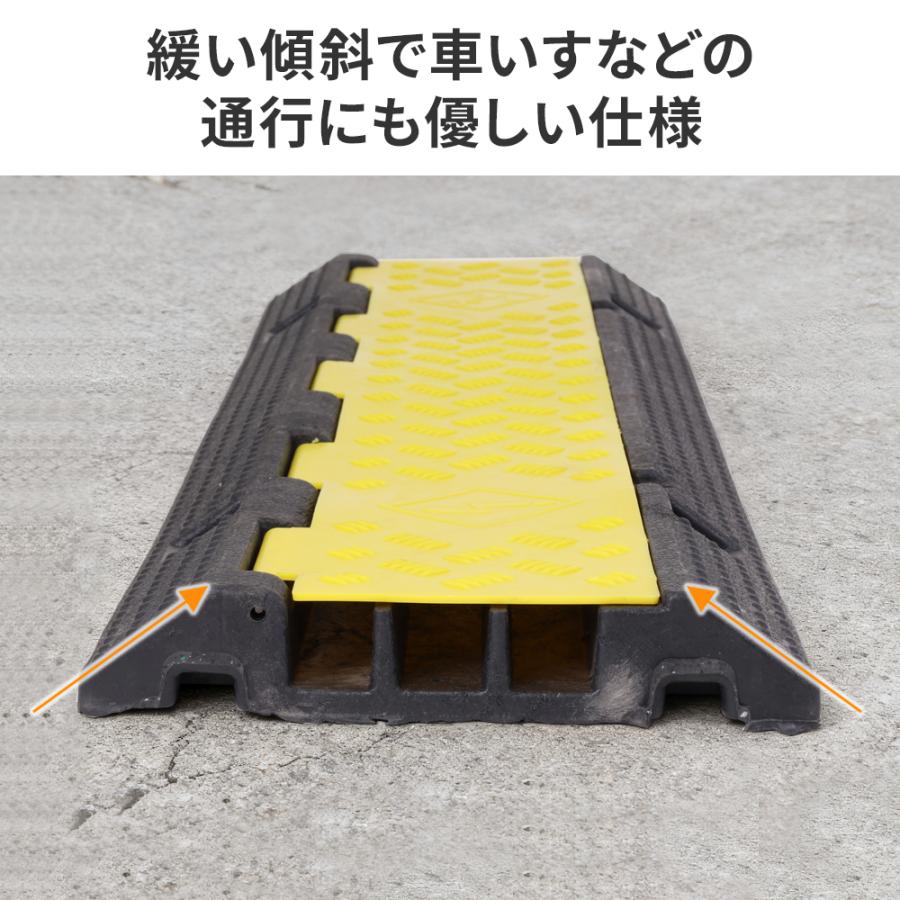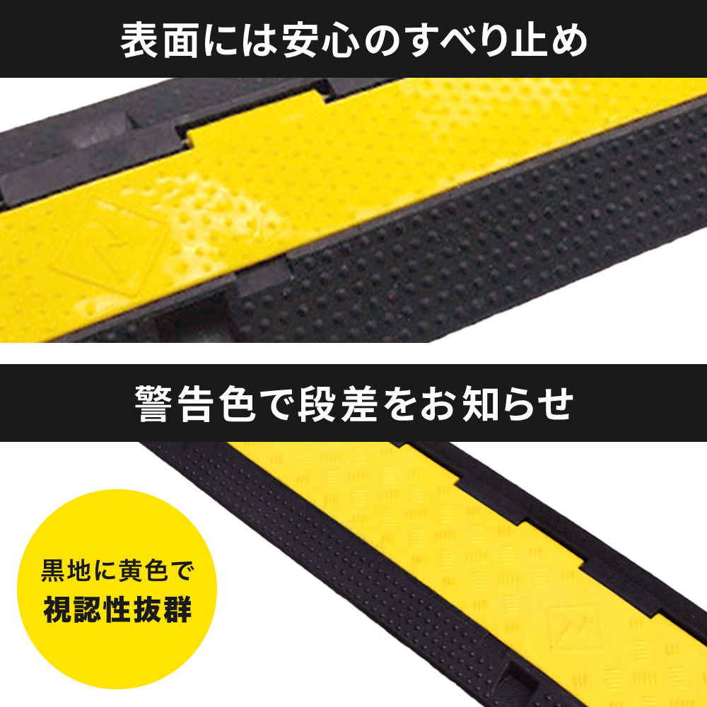| ◇ごちゃっとケーブル すっきりまとめる 工場や倉庫、お祭り、イベント会場など機材が多い場所では床にケーブルが散乱しがち...。 足を引っかけて転び怪我をしたり、機材を倒して壊してしまう危険性も。 ケーブルプロテクターを使ってごちゃっとしたケーブルをすっきりまとめましょう! ◇多数のケーブルがあっても安心 いろんな種類のケーブルを使用しており、まとめてしまうとどれがどれだかわからなくなってしまうことも。 種類ごとにまとめておくことができます。途中で枝分かれしても大丈夫! ◇耐荷重は最大3トン 耐荷重は最大約3t!※3・5レーンタイプのみ トラックが通っても大丈夫なので、運送トラックが出入りする場所でも安心して使えます。 ◇表面にはすべり止め 表面にはすべり止め加工が施してあるので、車や台車、人が通っても滑りにくく安心です。 ◇警告色で段差をお知らせ 黒地に黄色で視認性抜群! 警告色で段差があることを知らせます。 【商品詳細】 ー2レーンタイプー ■サイズ(約):幅98.4×高さ4×奥行20cm(突起部含まず) ■重量(約):3.3kg ■耐荷重(約):500kg ■材質:PVC ー3レーンタイプー ■サイズ(約):幅100×高さ5×奥行30cm ■重量(約):6kg ■耐荷重(約):500kg ■材質:ゴム+プラスチックの合成樹脂 ー5レーンタイプー ■サイズ(約):幅90×高さ5×奥行50cm ■重量(約):9.5kg ■耐荷重(約):700kg ■材質:ゴム+プラスチックの合成樹脂 ※全サイズ2個、4個、6個、8個、10個での購入が可能です |