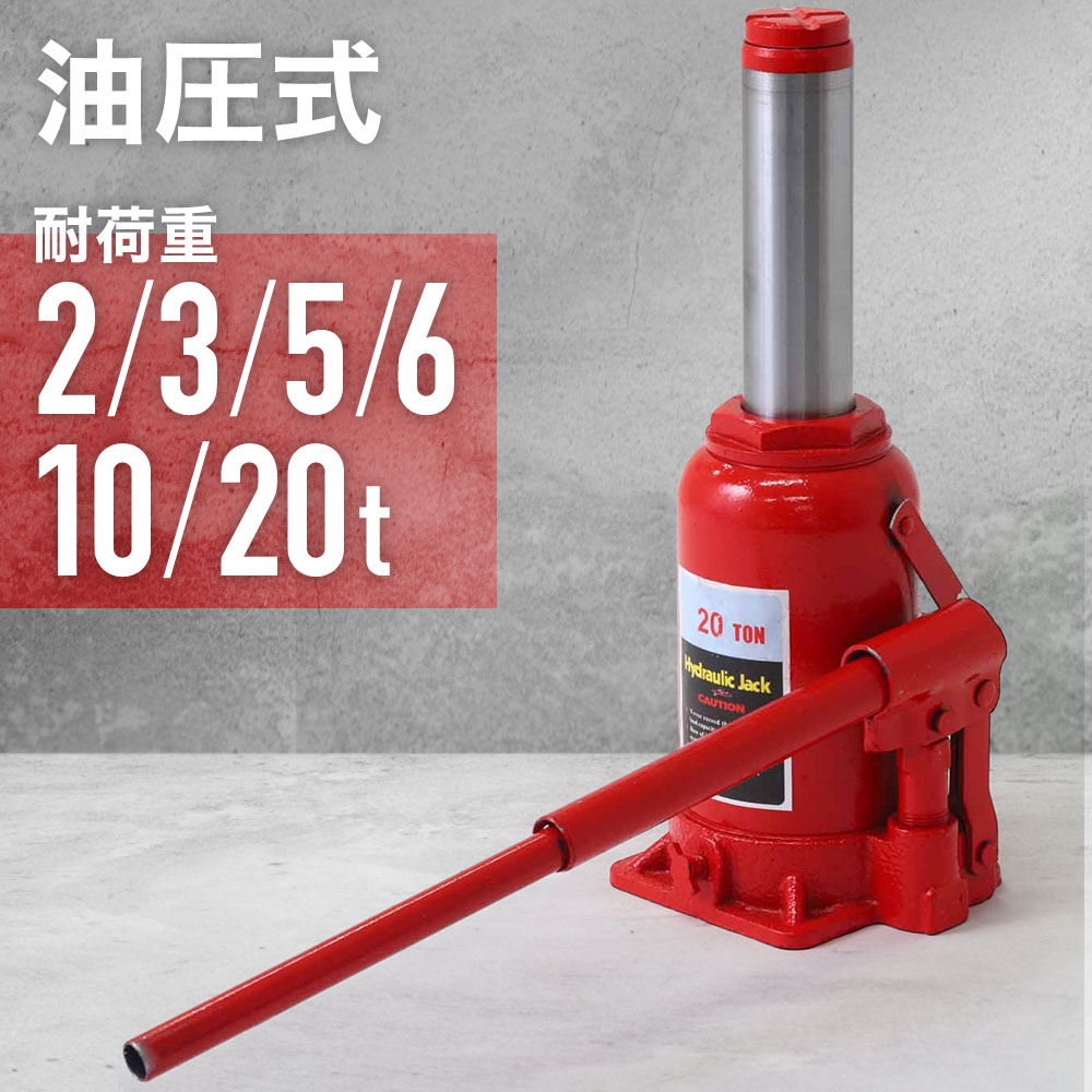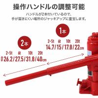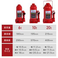 【2tタイプ】 ■サイズ(約) 本体:幅9×奥行8.5×高さ15cm ハンドル(大):直径1.8×長さ14.7cm ハンドル(小):直径1.5×長さ14.7cm ハンドル(連結時):長さ16.2cm 荷台:直径2cm ラム:長さ9.5cm 調節ネジ:長さ5.3cm ■上げ幅:(最高位)290mm〜(最低位)145mm ■耐荷重(約):2t ■本体重量(約):2kg 【3tタイプ】 ■サイズ(約) 本体/幅9×奥行8.5×高さ16cm ハンドル(大)/直径2×長さ14.7cm ハンドル(小)/直径1.5×長さ11.5cm ハンドル(連結時)/長さ26.2cm、ラム/長さ10cm、調節ネジ/6cm ■上げ幅:最低158mm〜最高320mm ■重量(約):2kg ■耐荷重:3t 【5tタイプ】 ■サイズ(約) 本体/幅10.5×奥行9.5×高さ18.5cm ハンドル(大)/直径2×長さ14.7cm ハンドル(小)/直径1.5×長さ11.5cm ハンドル(連結時)/長さ26.2cm、調節ネジ/6cm ■上げ幅:最低175mm〜最高350mm ■重量(約):2.6kg ■耐荷重(約):5t 【6tタイプ】 ■サイズ(約):18×10.5×10.5cm ■耐荷重量(最大荷重):6トン ■適用車両:車両重量6000kg以下 ■上げ幅:最小/180mm、最大/290mm 【10tタイプ】 ■サイズ(約) 本体/幅11.5×奥行9.5×高さ20.5cm ハンドル(大)/直径2×長さ17.8cm ハンドル(小)/直径1.5×長さ14cm ハンドル(連結時)/長さ31.8cm、調節ネジ/7cm ■上げ幅:最低195mm〜最高370mm ■重量(約):3.6kg ■耐荷重(約):10t 【20tタイプ】 ■サイズ(約) 本体/幅3.7×奥行11.5×高さ21.5cm ハンドル(大)/直径2×長さ22cm ハンドル(小)/直径1.5×長さ18cm ハンドル(連結時)/長さ40cm、調節ネジ/6.7cm ■上げ幅:最低215mm〜最高405mm ■重量(約):6.4kg ■耐荷重(約):20t |