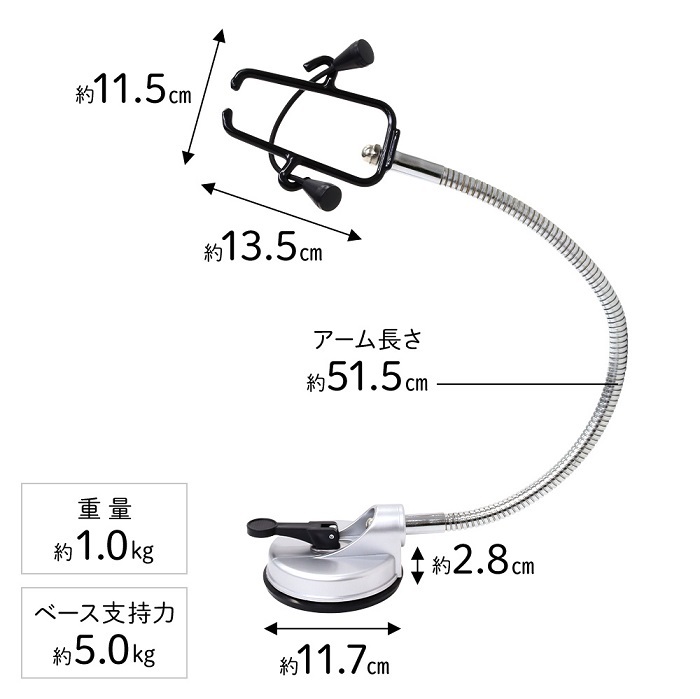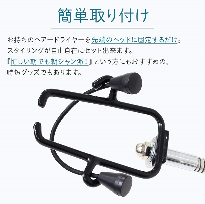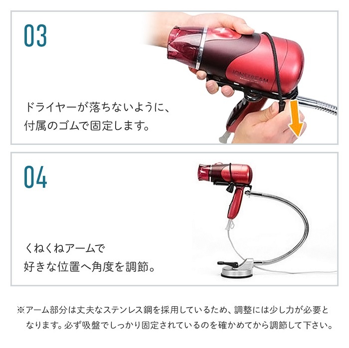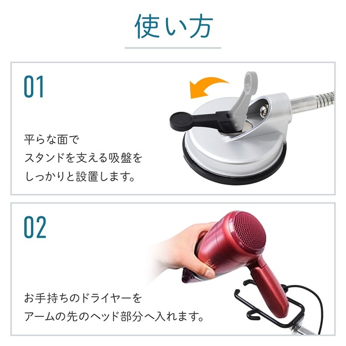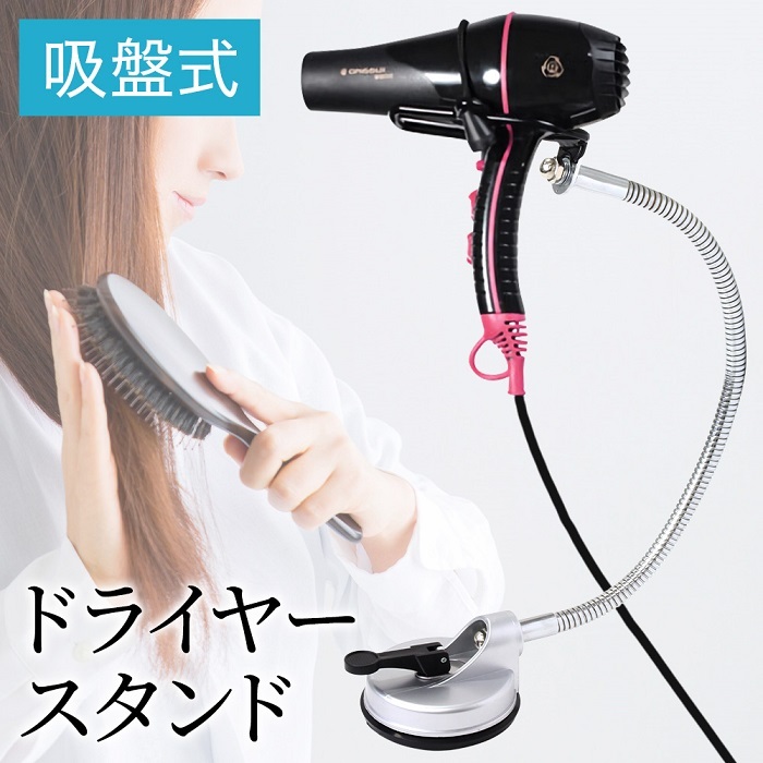 | お持ちのヘアードライヤーを先端のヘッドに固定するだけの簡単取り付け。 ドライヤーを固定しておけるのでスタイリングが自由自在にできます。 「忙しい朝でも朝シャン派!」という方にもおすすめの時短グッズでもあります。 強力吸盤タイプなので、平らな場所であればどこにでも設置可能。 洗面台の上など、省スペースで利用できます。 アーム部分は蛇腹仕様となっています。 角度と高さを360度自由に曲げて調節できるフレキシブルタイプ。 両手が使えるので思い通りのヘアースタイルに仕上げることができます。 動き回るペットやじっとできない小さなお子様のいるご家庭にも大活躍! ドライヤーを持たなくてもいいので、身体を支えたり、髪を掻いて乾かしたりするのも楽ちんです。 ドライヤーをするのめんどくさい…という短髪の方も、固定して両手でさっと乾かすことができます。 [使い方] 1.平らな面でスタンドを支える吸盤をしっかりと設置します。 2.お手持ちのドライヤーをアームの先のヘッド部分へ入れます。 3.ドライヤーが落ちないように付属のゴムで固定します。 4.くねくねアームで好きな位置へ角度を調節します。 【商品詳細】 サイズ(約):アーム長さ/515mm、ヘッド/135×115mm(突起部含む)、吸盤/直径117×厚さ6mm 重量(約):1kg ベース支持力:約5kg 材質:ステンレス鋼、アルミ合金、プラスチック [使用上の注意] ・吸盤部分はドライヤーの重みに耐えられるよう、かために作られています。 そのため部品の固定に力が必要となります。 土台と平行にして固定されていない場合は簡単に外れてしまう危険がございますのでご注意ください。 ・アーム部分は丈夫なステンレス鋼を採用しているため、調整には少し力が必要となります。 必ず吸盤がしっかり固定されているのを確認してから調節してください。 |
