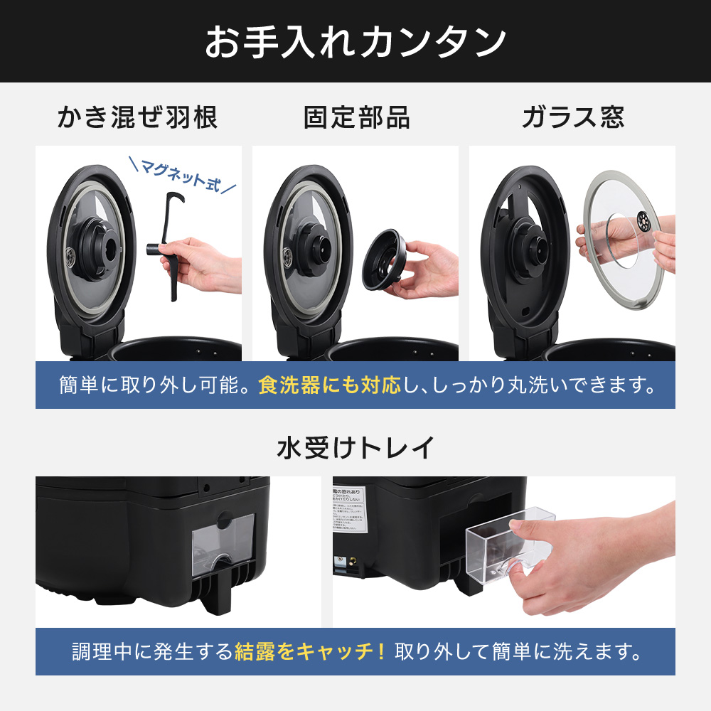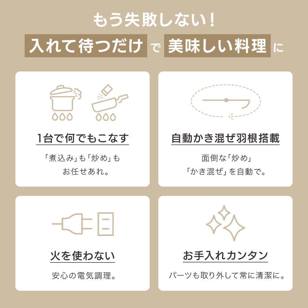 自動かき混ぜ羽根 調理中に自動でかき混ぜてくれる羽根があるから、ほったらかしで簡単に料理ができあがります。
