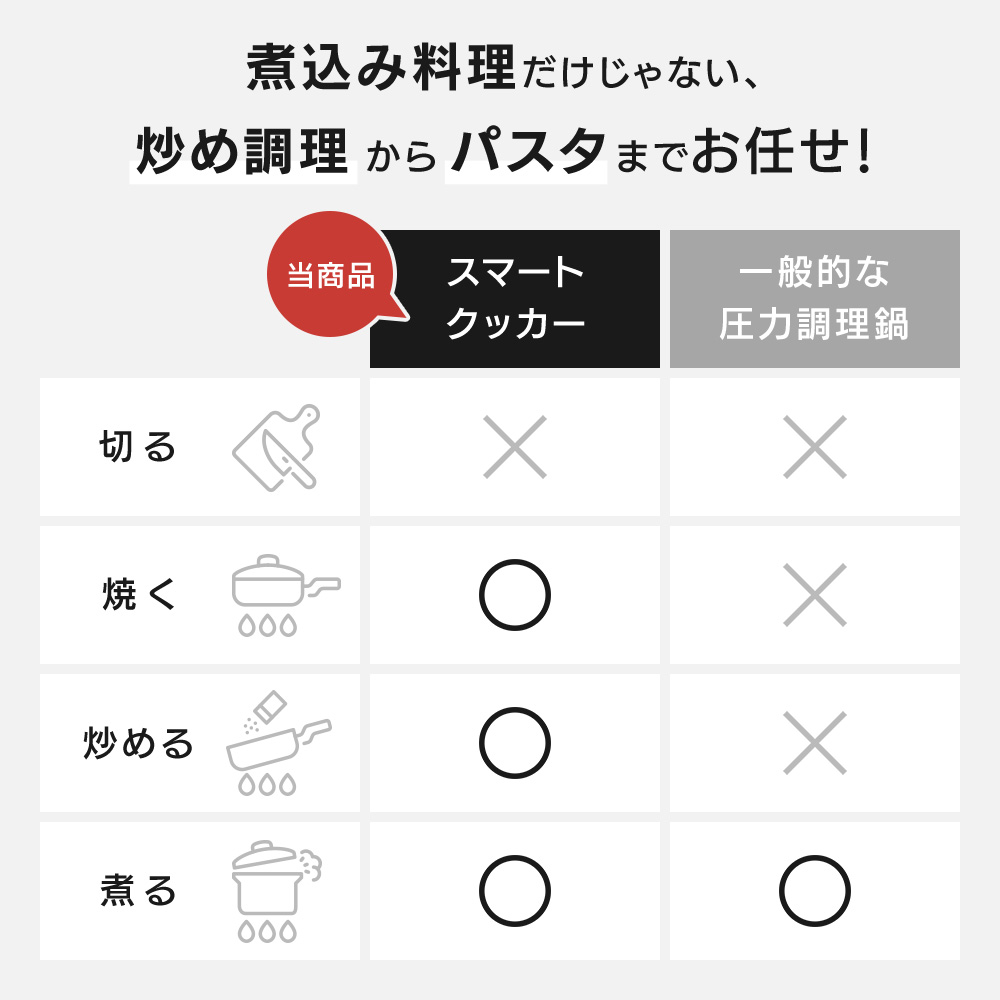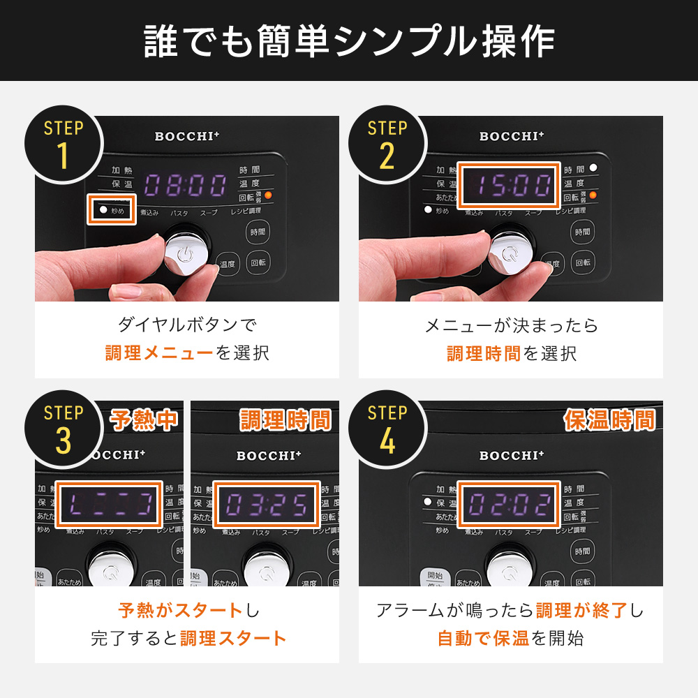 材料を入れてボタンを押すだけで“すべて自動”でやってくれる全自動調理器。 混ぜるのもやってくれるからカレーやチャーハンなどもほったらかしでOK! セットしたら後はお風呂に入ったり、テレビを観たりと、自由な時間を増やすことができます。