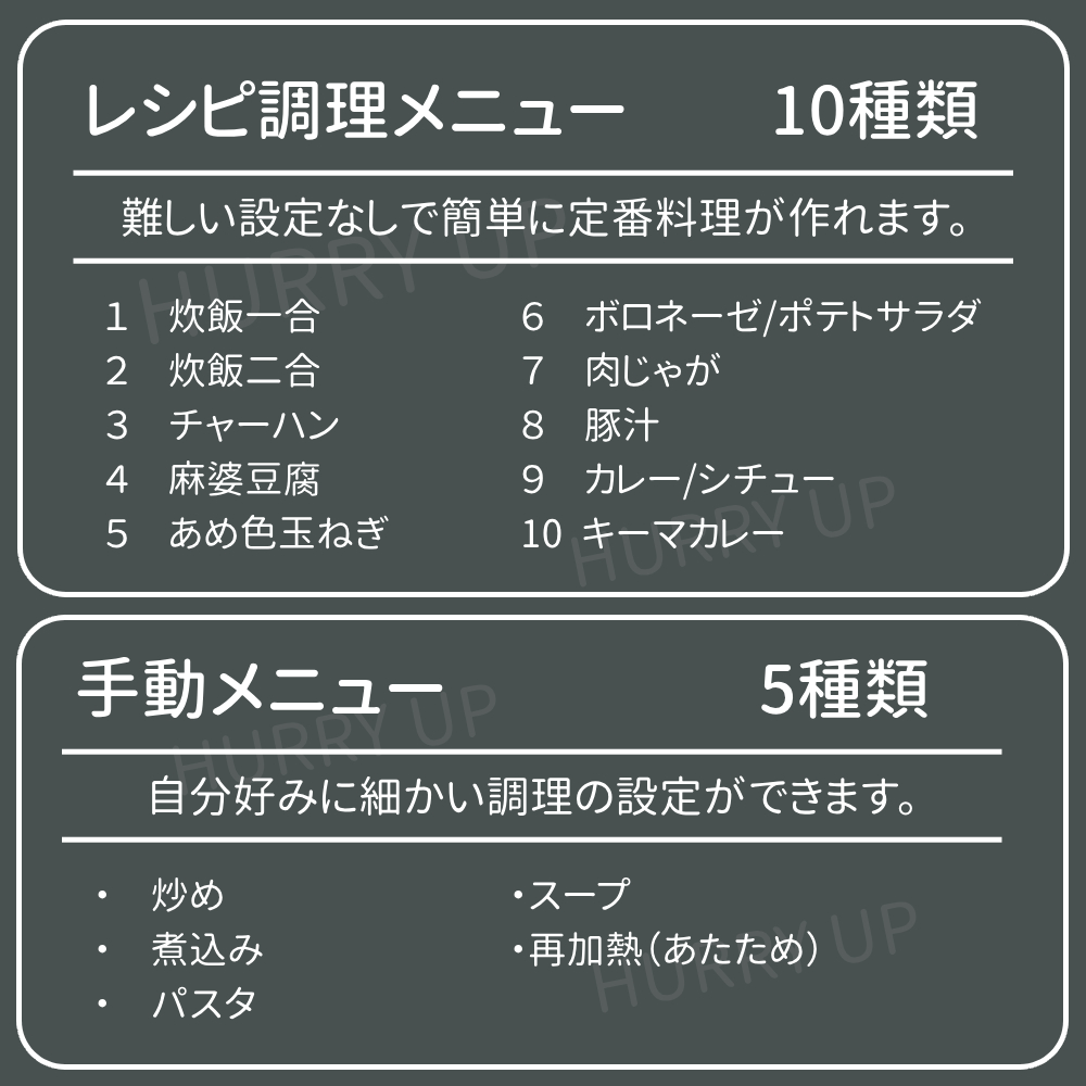 メニュー数は15種類 設定不要の簡単レシピ調理メニューが10種類、自分で自由に設定できる手動メニューが5種類搭載されています。