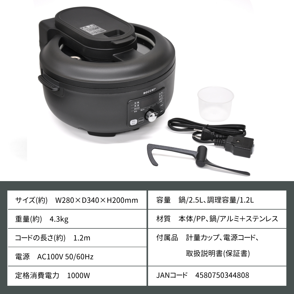 【商品詳細】 サイズ(約):W280×D340×H200mm 重量(約):4.3kg コードの長さ(約):1.2m 電源:AC100V 50/60Hz 定格消費電力:1000W 容量:鍋/2.5L、調理容量/1.2L 材質:本体/PP、鍋/アルミ+ステンレス 付属品:計量カップ、電源コード、取扱説明書(保証書) JANコード:4580750344808