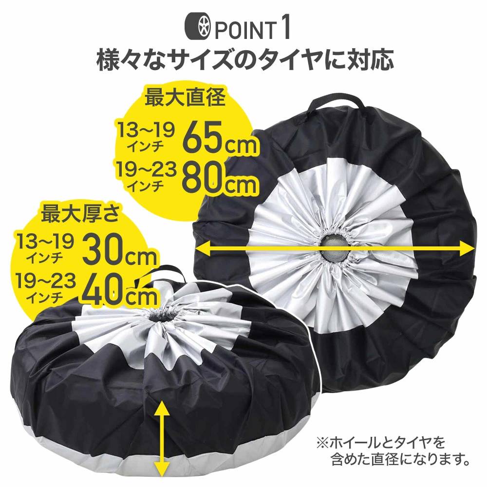 直径65cm、幅30cmまでのタイヤを収納できるため、様々な車種のタイヤに対応可能。