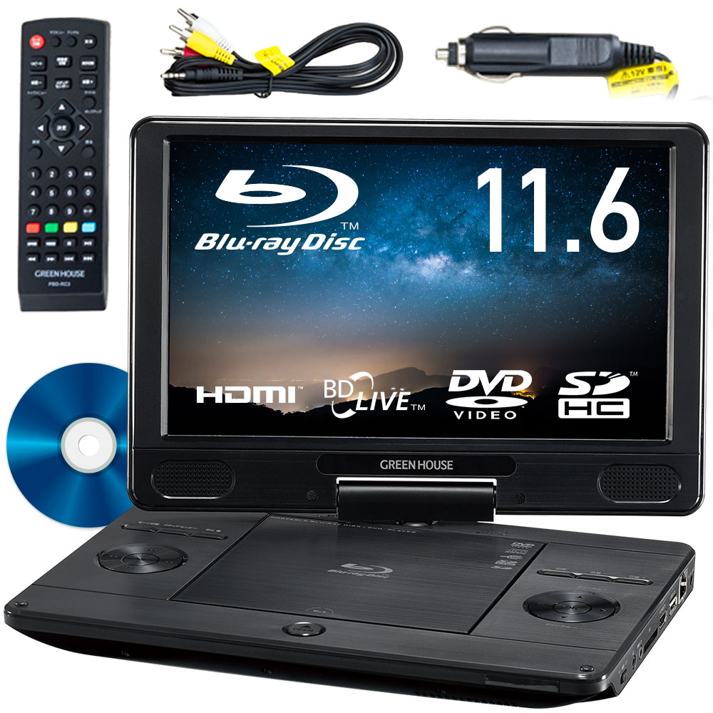 グリーンハウス ポータブルブルーレイプレーヤー GH-PBD11B-BK ブルーレイをどこでも楽しめる! 大画面11.6型ワイド液晶ポータブルブルーレイプレーヤー 外出先でも美しい映像を楽しめる ACアダプタ、シガーソケット、バッテリーの3電源仕様でどこでも大画面で映像を楽しめます。 地デジを録画したディスクも楽しめるBDAV・CPRM(VRモード)対応 ※BDAVとはBD-R、BD-REなどの書き込み式Blu-ray Discで利用されている記録形式です。 多数の外部入出力端子搭載 映像入力やUSB入力、SDカードスロット、HDMI出力などを搭載。 ビデオカメラやUSBメモリのデータを再生したり、HDMIケーブルをテレビと繋いでさらに大画面で映像を楽しんだりと多様に使えます。 180度回転して折りたためる大画面11.6型ワイド液晶 置き場所に合わせて180度画面の向きを調整可能。 サイドテーブルなど限られたスペースにも設置しやすくなっています。 前回の続きから再生できるレジューム機能対応 DVDを見ている途中で電源を切っても、次回その続きから見ることができます。 【商品詳細】 サイズ(約):W290×D200×H50mm 重量(約):1170g 電源:ACアダプタ 入力AC100V 50/60HZ・出力DC12V/2A、シガーアダプタ 入力DC12V/2A・出力DC12V/2A 消費電力:最大20W バッテリー:再生時間/BD再生時 約3時間、充電時間/約7時間 ディスプレイ:11.6型ワイドTFT液晶(LED) 1366×768ピクセル(16:9) 対応ディスクフォーマット:BDMV、BDAV、AVCHD(1.0)、AVCREC、DVD-VIDEO、DVD-VR(CPRM対応)、CD-DA、データDVD、データCD 対応ディスクタイプ:BD-ROM、BD-R(LTH対応)、BD-R DL、BD-RE、BD-RE DL、DVD-ROM、DVD±R、DVD±R DL、DVD±RW、CD-ROM、CD-R、CD-RW 対応BDプロファイル:1.1(BONUSVIEW)、2.0(BD-LIVE) 対応外部メモリー:SDカード(〜2GB)、SDHCカード(〜32GB)、USBメモリー(〜32GB) 対応ファイル形式:MPEG-1、MPEG-2、MPEG-4/MP3(64kbps〜320kbps)、JPEG、GIF、PNG 信号方式:NTSC 映像出力解像度:1080p、1080i、720p、480p、480i スピーカー:2chステレオ(2W×2) 搭載端子:USBポート、SDカードスロット、3.5ヘッドホン出力端子、映像入力端子(コンポジット映像信号)、HDMI出力端子、LANポート、電源入力端子 付属品:専用リモコン、リモコンテスト用電池(単4形乾電池2本)、専用AVケーブル(115cm)、専用ACアダプタ(150cm)、専用シガーソケット(約190cm)、取扱説明書、保証書 JANコード:4511677125898 |