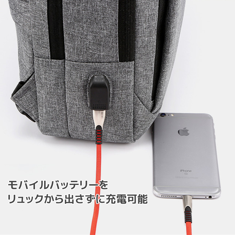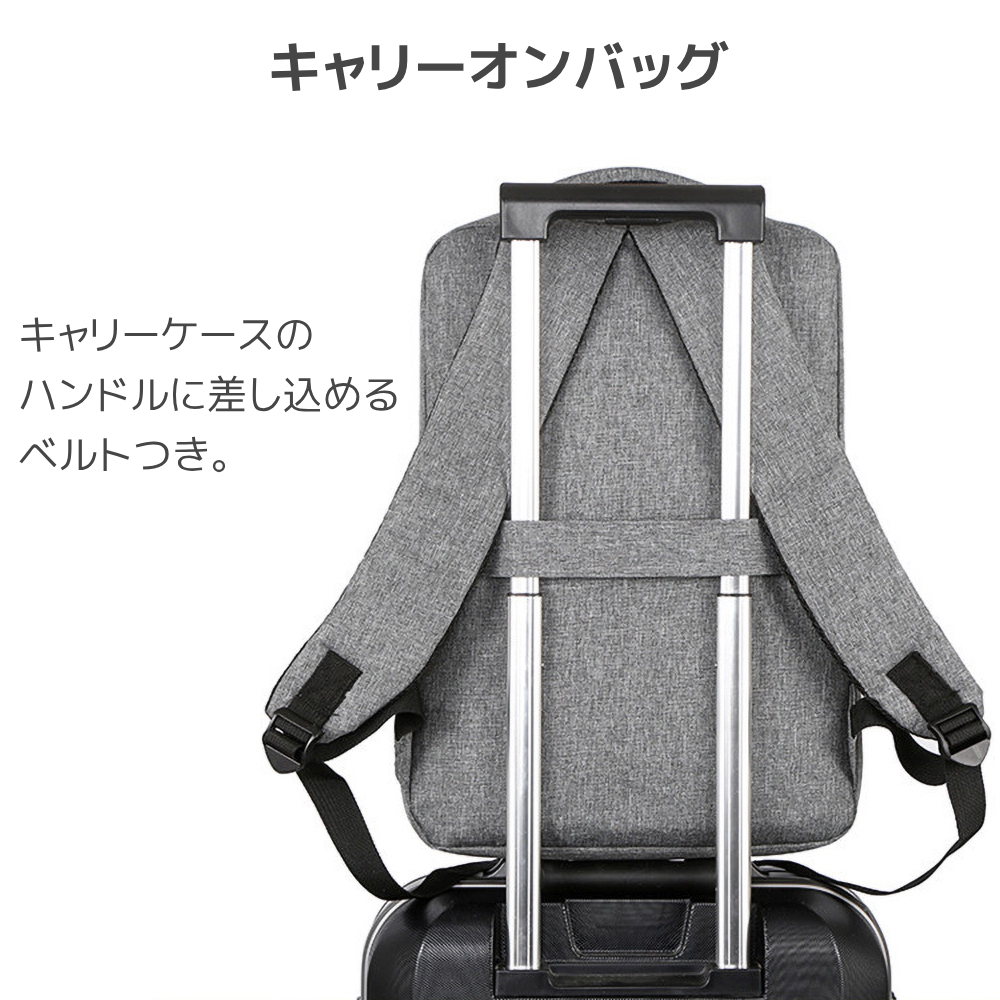 | たくさん入れても型崩れしにくい! 3段構造になっていて、通勤や通学、出張に最適。 もちろん普段使いにもおすすめの、シンプル&多機能リュックです。 ポケットが多くて使いやすさ抜群 前面のサイドポケットは大きく開き、タブレットも楽に出し入れできます。 その他内側にも広いポケットや小物を入れるポケットがついており、整理がしやすくなっています。 USBポート付き リュックの中にモバイルバッテリーを入れてリュックのUSBポートに繋いでおけば、リュックからモバイルバッテリーを出すことなくスマートフォンなどの充電ができます。 リュック・肩掛け・手持ちの3way仕様 ショルダーストラップの長さ調節が可能なのはもちろんなこと、本体へ収納も可能。 背負い、肩掛け(ショルダー片方収納)、両方に対応できます。 また、リュック本体には手持ちにできるハンドルが2個所ついているので、場面に合わせて3way使用が可能です。 キャリーオンバッグ リュック裏面には、キャリーケースのハンドルに差し込めるベルトがついています。 出張や旅行で荷物が多くなっても楽に持ち運べます。 【商品詳細】 サイズ(約):本体/高さ40×幅29×奥行10cm、持ち手/各17cm、ショルダー/42〜79cm、USBケーブル/17cm 重量(約):556g カラー: グレー / ネイビー ※一部商品画像に取り扱い無しカラーを使用しています。 ※モバイルバッテリー、充電ケーブルは付属しません。 |