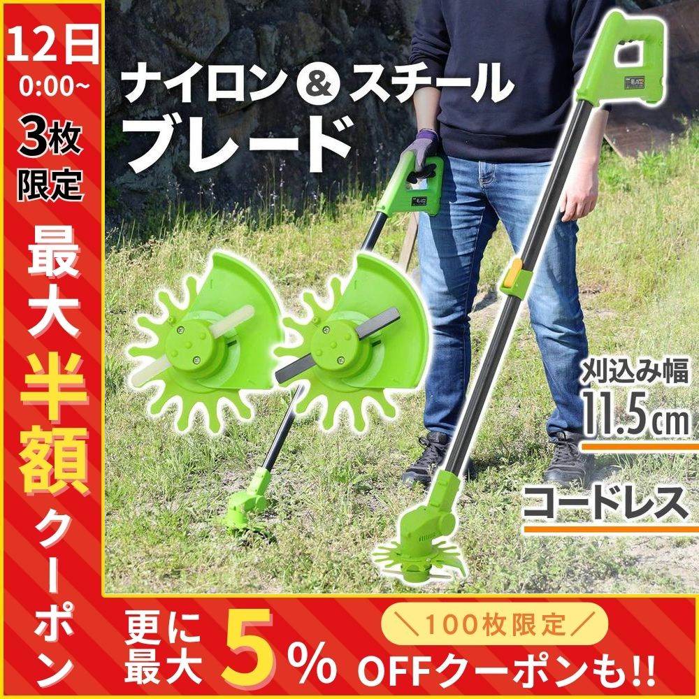 コードレスでどこでも使える草刈り機 高速回転するブレード2枚刃で伸び切った太い草や小枝をラクラクカット!