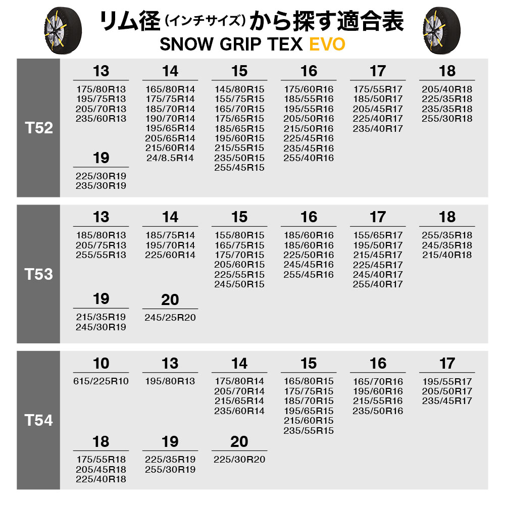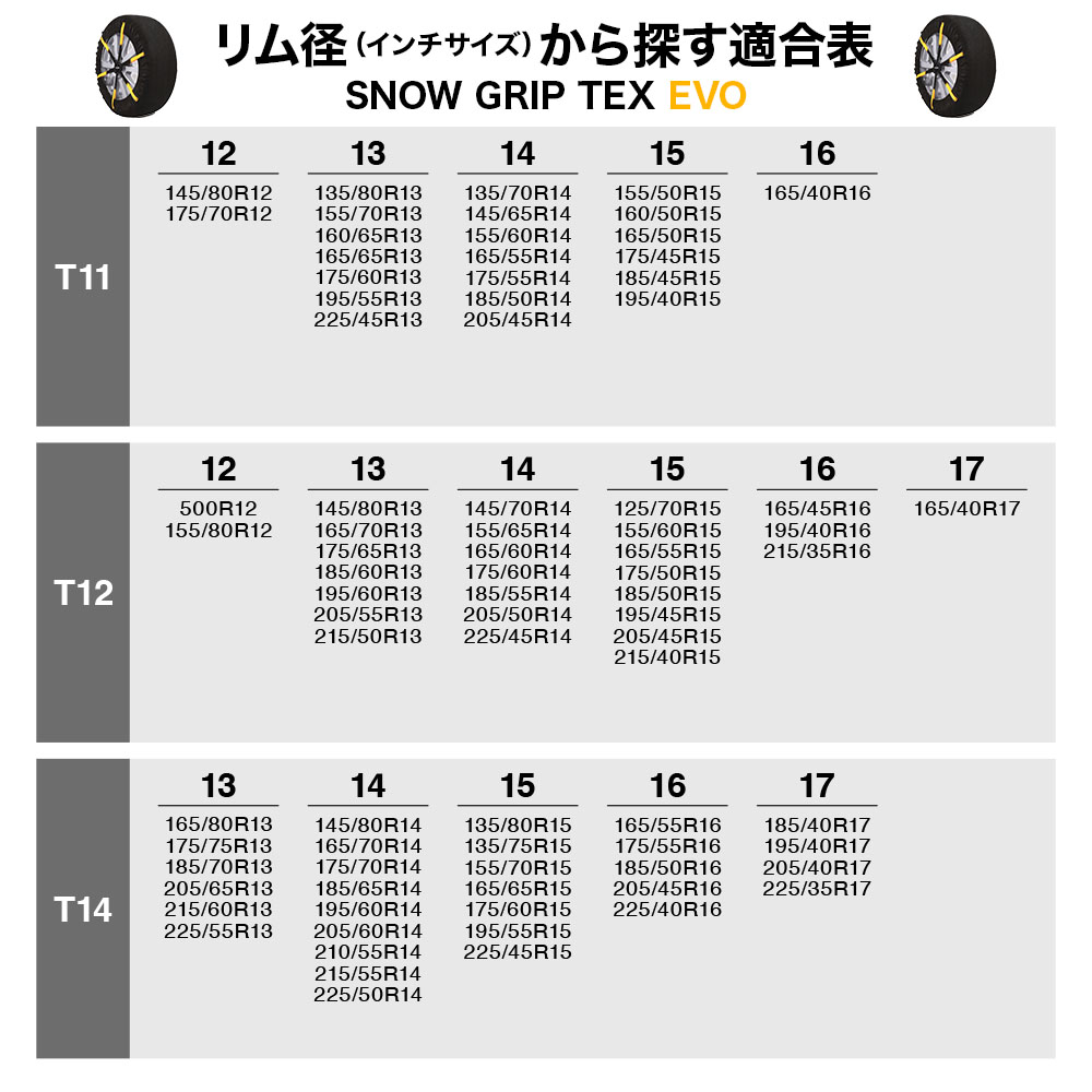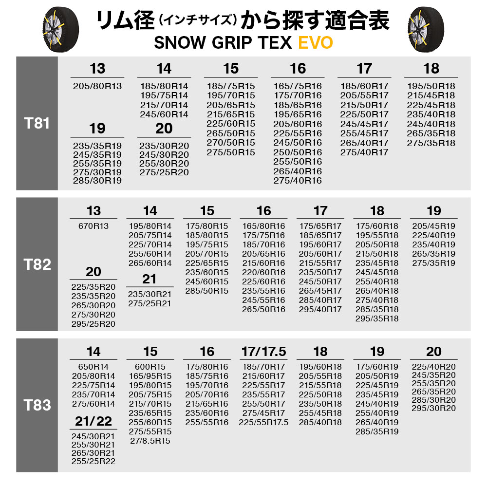 | 【適合タイヤサイズ表】 【T11】 145/80R12 175/70R12 135/80R13 155/70R13 160/65R13 165/65R13 175/60R13 195/55R13 225/45R13 135/70R14 145/65R14 155/60R14 165/55R14 175/55R14 185/50R14 205/45R14 155/50R15 160/50R15 165/50R15 175/45R15 185/45R15 195/40R15 165/40R16 160/65R340 170/60R340 150/65R345 155/540R360 165/45R400 【T12】 500R12 155/80R12 145/80R13 165/70R13 175/65R13 185/60R13 195/60R13 205/55R13 215/50R13 145/70R14 155/65R14 165/60R14 175/60R14 185/55R14 205/50R14 225/45R14 125/70R15 155/60R15 165/55R15 175/50R15 185/50R15 195/45R15 205/45R15 215/40R15 165/45R16 195/40R16 215/35R16 165/40R17 170/65R335 170/65R340 180/60R340 200/55R340 160/65R345 170/60R365 【T14】 165/80R13 175/75R13 185/70R13 205/65R13 215/60R13 225/55R13 145/80R14 165/70R14 175/70R14 185/65R14 195/60R14 205/60R14 210/55R14 215/55R14 225/50R14 135/80R15 135/75R15 155/70R15 165/65R15 175/60R15 195/55R15 225/45R15 165/55R16 175/55R16 185/50R16 205/45R16 225/40R16 185/40R17 195/40R17 205/40R17 225/35R17 190/65R340 165/70R365 170/65R365 190/60R365 210/55R365 220/45R390 【T52】 175/80R13 195/75R13 205/70R13 235/60R13 165/80R14 175/75R14 185/70R14 190/70R14 195/65R14 205/65R14 215/60R14 24/8.5R14 145/80R15 155/75R15 165/70R15 175/65R15 185/65R15 195/60R15 215/55R15 235/50R15 255/45R15 175/60R16 185/55R16 195/55R16 205/50R16 215/50R16 225/45R16 235/45R16 255/40R16 175/55R17 185/50R17 205/45R17 225/40R17 235/40R17 205/40R18 225/35R18 235/35R18 255/30R18 225/30R19 235/30R19 210/65R340 190/65R365 210/60R365 230/55R365 190/60R390 200/55R390 210/55R390 250/45R390 220/45R415 230/45R415 195/620R420 205/45R425 【T53】 185/80R13 205/75R13 255/55R13 185/75R14 195/70R14 225/60R14 155/80R15 165/75R15 175/70R15 205/60R15 225/55R15 245/50R15 185/60R16 185/60R16 225/50R16 245/45R16 255/45R16 155/65R17 195/50R17 215/45R17 225/45R17 245/40R17 255/40R17 215/40R18 245/35R18 255/35R18 215/35R19 245/30R19 245/25R20 200/65R365 220/60R365 240/55R365 200/60R390 220/55R390 240/45R415 200/45R450 205/45R450 220/40R450 230/40R450 250/35R450 260/35R450 【T54】 615/225R10 195/80R13 175/80R14 205/70R14 215/65R14 235/60R14 165/80R15 175/75R15 185/70R15 195/65R15 215/60R15 235/55R15 165/70R16 195/60R16 215/55R16 235/50R16 195/55R17 205/50R17 235/45R17 175/55R18 205/45R18 225/40R18 225/35R19 255/30R19 225/30R20 210/65R365 230/60R365 250/55R365 190/65R390 195/65R390 210/60R390 230/55R390 250/45R415 210/45R450 【T81】 205/80R13 185/80R14 195/75R14 215/70R14 245/60R14 185/75R15 195/70R15 205/65R15 215/65R15 225/60R15 265/50R15 270/50R15 275/50R15 165/75R16 175/70R16 185/65R16 195/65R16 205/60R16 225/55R16 245/50R16 250/50R16 255/50R16 265/40R16 275/40R16 185/60R17 205/55R17 215/50R17 225/50R17 245/45R17 255/45R17 265/40R17 275/40R17 195/50R18 215/45R18 225/45R18 235/40R18 245/40R18 265/35R18 275/35R18 235/35R19 245/35R19 255/35R19 275/30R19 285/30R19 235/30R20 245/30R20 255/30R20 275/25R20 220/65R365 200/65R390 220/60R390 240/55R390 180/65R415 220/55R415 205/650R440 215/650R440 235/660R460 225/40R475 【T82】 670R13 195/80R14 205/75R14 225/70R14 255/60R14 265/60R14 175/80R15 185/80R15 195/75R15 205/70R15 225/65R15 235/60R15 245/60R15 285/50R15 165/80R16 175/75R16 185/70R16 205/65R16 215/60R16 220/60R16 225/60R16 235/55R16 245/55R16 265/50R16 175/65R17 185/65R17 195/60R17 205/60R17 215/55R17 235/50R17 245/50R17 265/45R17 285/40R17 295/40R17 175/60R18 195/55R18 205/50R18 215/50R18 235/45R18 245/45R18 255/40R18 265/40R18 275/40R18 285/35R18 295/35R18 205/45R19 225/40R19 235/40R19 265/35R19 275/35R19 225/35R20 235/35R20 265/30R20 275/30R20 295/25R20 235/30R21 275/25R21 210/65R390 220/65R390 230/60R390 250/55R390 190/65R415 230/55R415 280/45R415 225/670R460 235/40R475 【T83】 650R14 205/80R14 225/75R14 235/70R14 275/60R14 600R15 165/95R15 195/80R15 205/75R15 215/70R15 235/65R15 255/60R15 275/55R15 27/8.5R15 175/80R16 185/75R16 195/70R16 205/70R16 215/65R16 235/60R16 255/55R16 185/70R17 215/60R17 225/55R17 235/55R17 255/50R17 275/45R17 225/55R17.5 195/60R18 205/55R18 215/55R18 225/50R18 235/50R18 255/45R18 285/40R18 175/60R19 205/50R19 225/45R19 235/45R19 245/40R19 255/40R19 265/40R19 285/35R19 225/40R20 245/35R20 255/35R20 265/35R20 285/30R20 295/30R20 245/30R21 255/30R21 265/30R21 255/25R22 230/65R390 240/55R415 250/55R415 245/680R460 245/690R500 265/680R500 【T86】 750R14 265/70R14 670R15 215/80R15 235/75R15 245/70R15 255/70R15 265/65R15 275/65R15 195/85R16 205/80R16 215/75R16 235/70R16 245/65R16 255/65R16 265/60R16 275/60R16 295/50R16 185/80R17 215/70R17 225/65R17 235/65R17 245/60R17 255/60R17 265/55R17 275/55R17 7R17.5 7/80R17.5 205/70R17.5 185/70R18 225/60R18 245/55R18 255/55R18 265/50R18 275/50R18 295/45R18 155/80R19 225/55R19 245/50R19 255/50R19 275/45R19 285/45R19 295/40R19 195/55R20 245/45R20 255/45R20 275/40R20 285/40R20 295/35R20 305/30R20 245/40R21 255/40R21 275/35R21 285/35R21 245/35R22 255/35R22 275/30R22 285/30R22 【T87】 9/80R15 225/80R15 245/75R15 265/70R15 30/10.5R15 30/9.5R15 600R16 640R16 215/80R16 9/75R16 225/75R16 235/75R16 245/70R16 265/65R16 285/60R16 195/80R17 225/70R17 235/70R17 245/65R17 265/60R17 275/60R17 7.5/80R17.5 205/75R17.5235/65R17.5 215/65R18 225/65R18 235/60R18 245/60R18 265/55R18 285/50R18 215/60R19 235/55R19 245/55R19 265/50R19 275/50R19 295/45R19 225/50R20 235/50R20 245/50R20 265/45R20 275/45R20 295/40R20 195/55R21 235/45R21 245/45R21 265/40R21 275/40R21 265/35R22 275/35R22 285/35R22 295/30R22 275/30R23 275/25R24 310/65R340 |