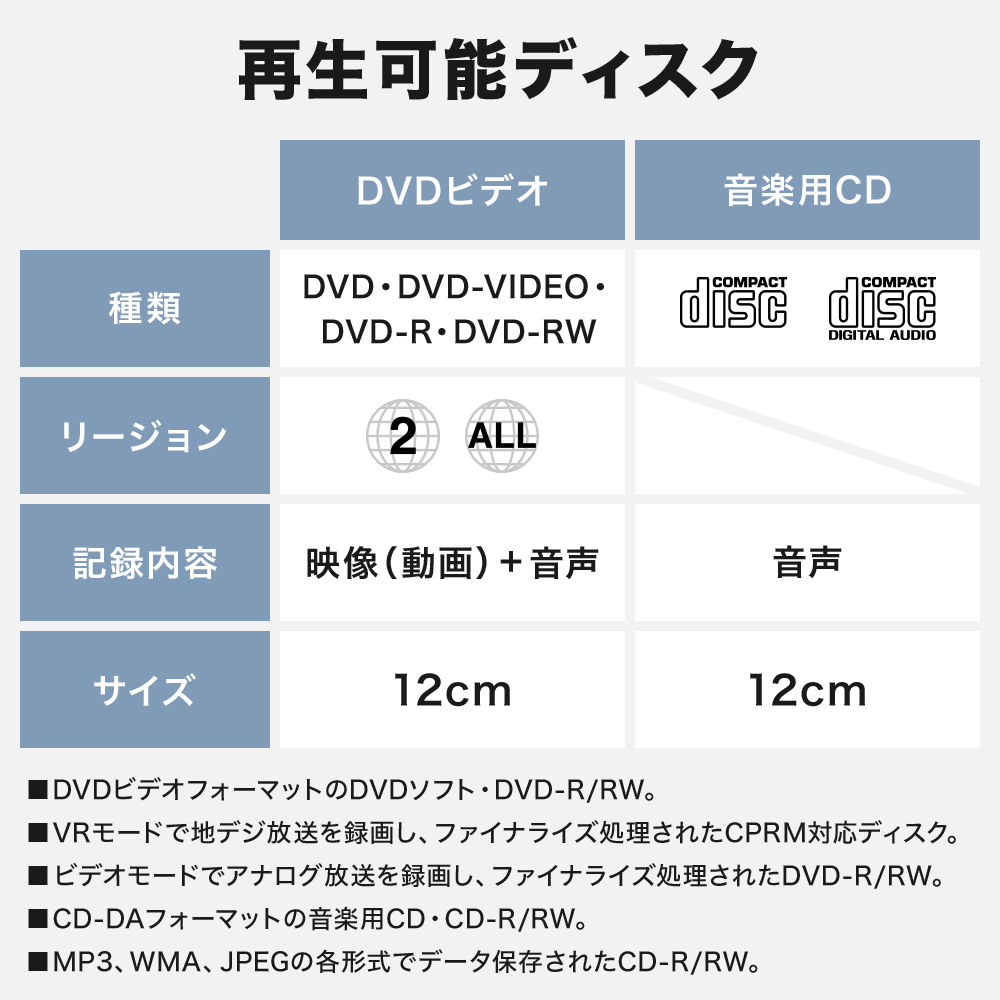 DVD/CD/USBメモリ再生OK!MP3・WMA・JPEG・MPEGファイル対応で音楽・写真もこれ1台。
