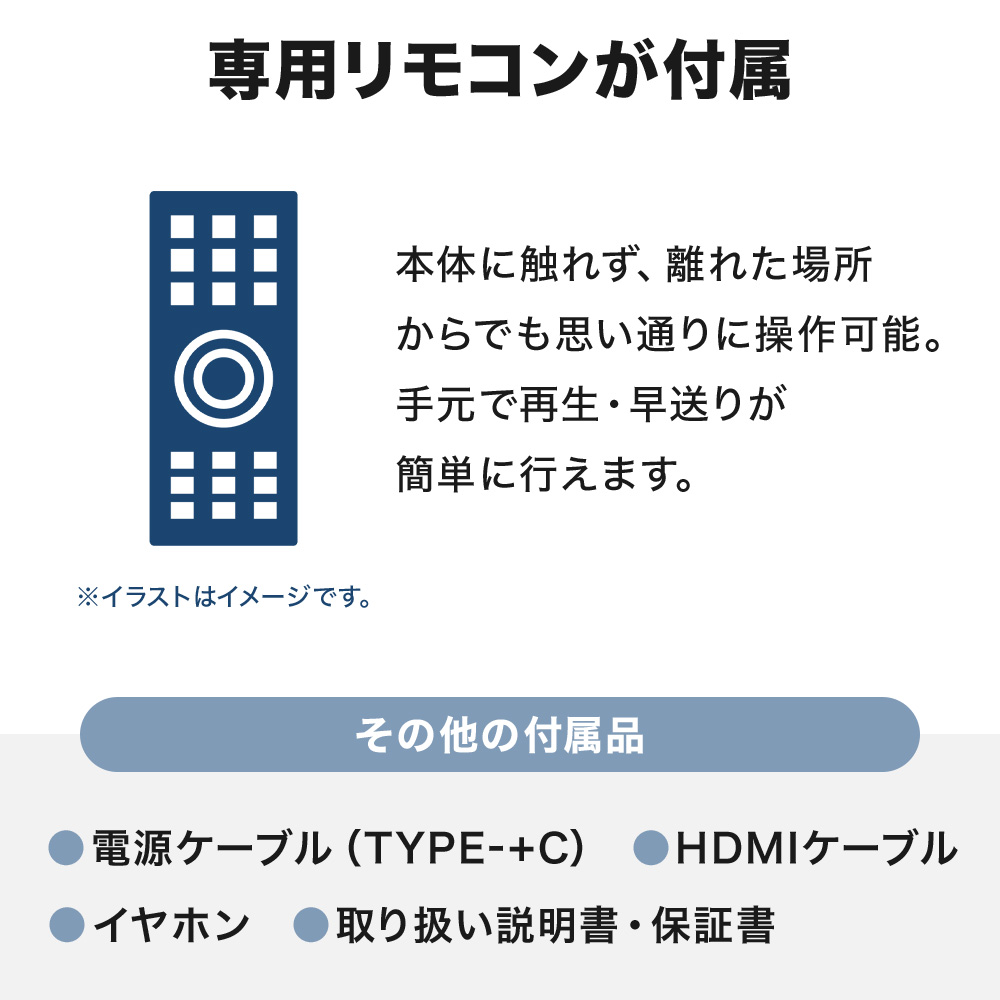 付属品:リモコン、TYPE-Cケーブル、HDMIケーブル、イヤホン、取扱説明書 兼 保証書