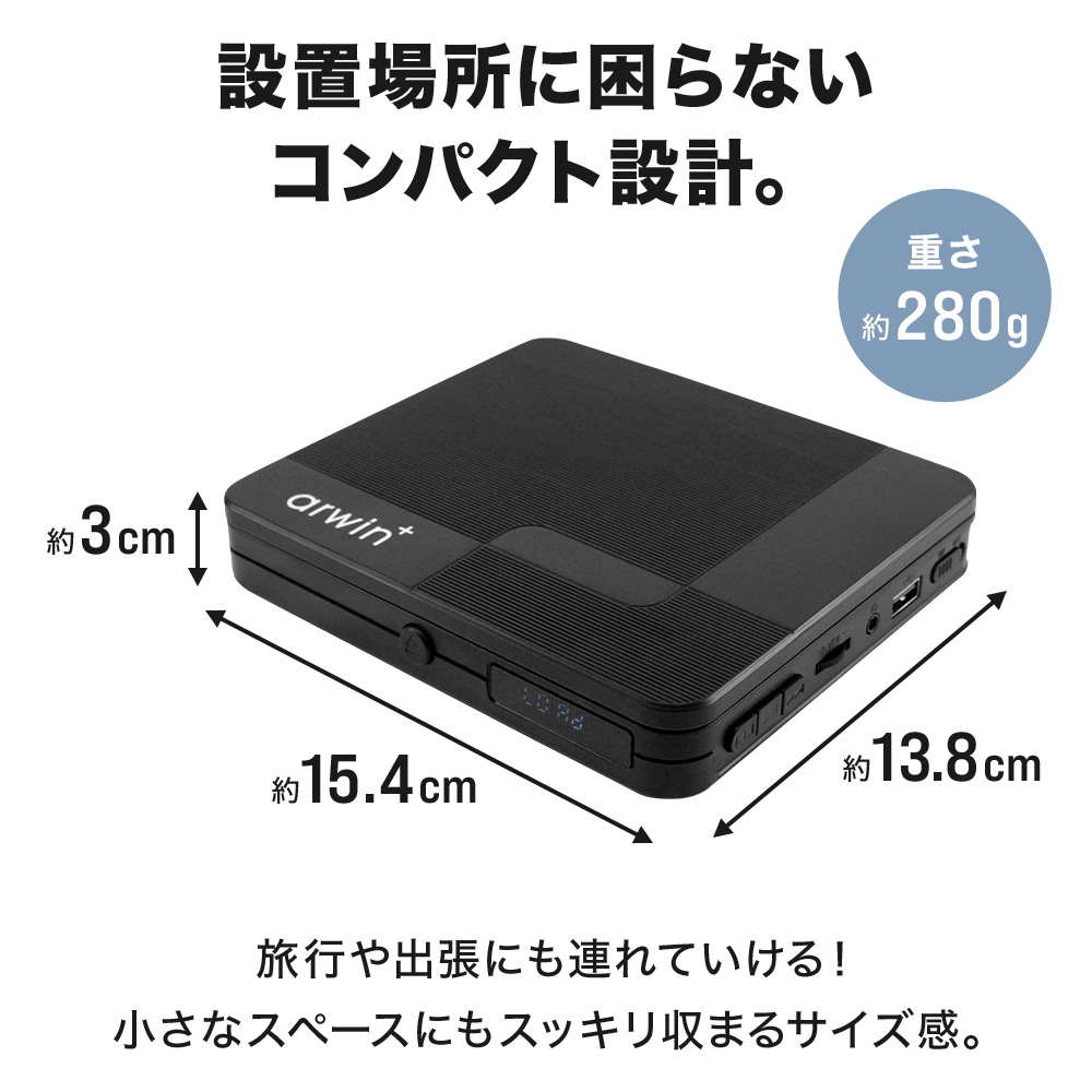 幅約15cm・重さわずか280g。どこでも気軽に使える超コンパクト設計。リビング・寝室・車中にも◎