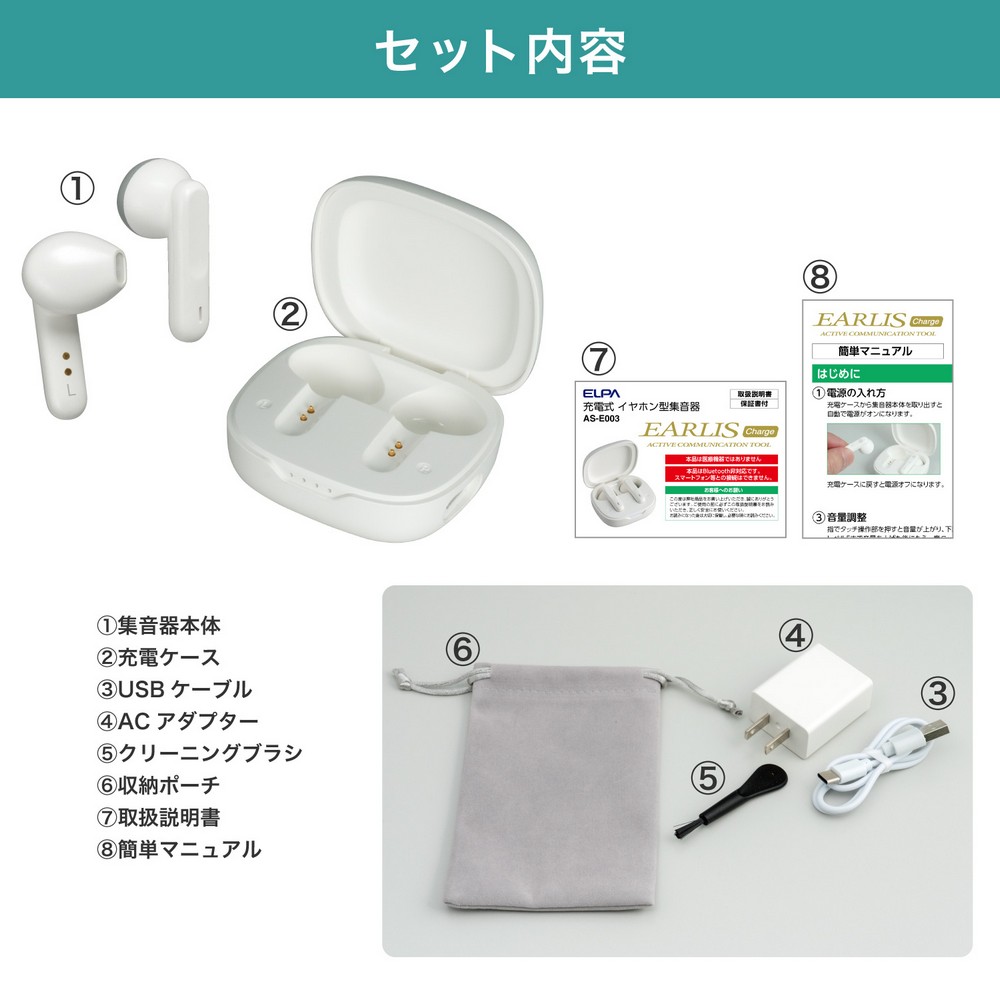 集音器本体、充電ケース、USBケーブル、ACアダプター、クリーニングブラシ、収納ポーチ、取扱説明書、簡単マニュアル