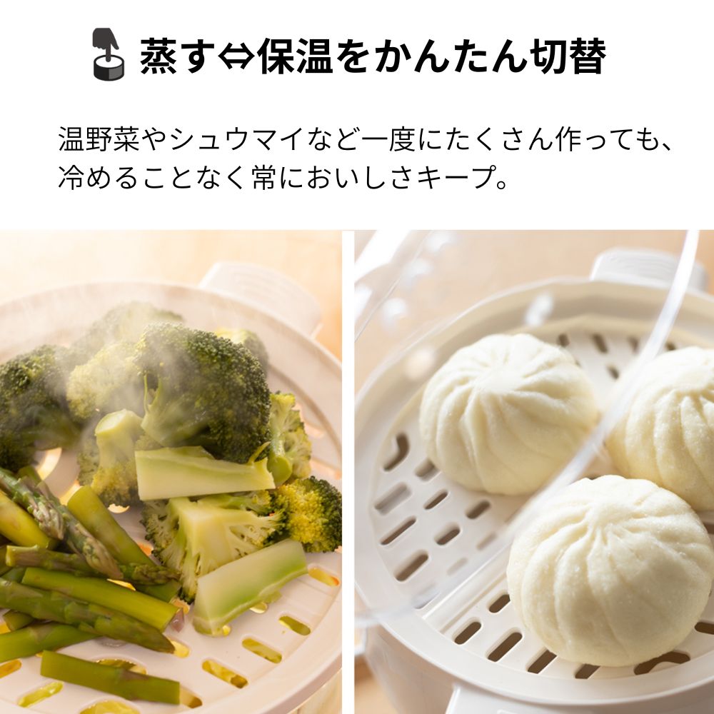 【蒸し上がり後は自動で温かさをキープ】 一度に多めに作っても、保温機能に切り替えることで食べ頃を保てます。