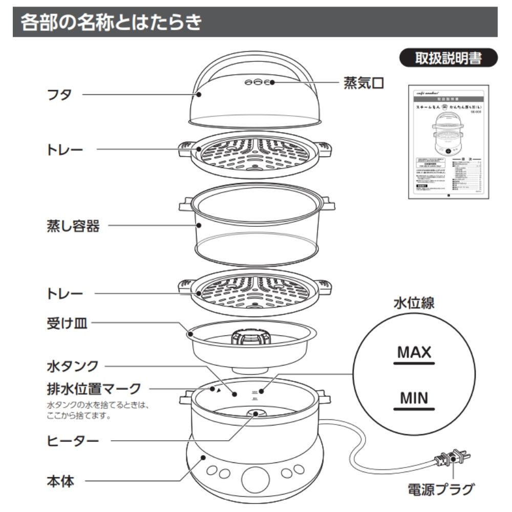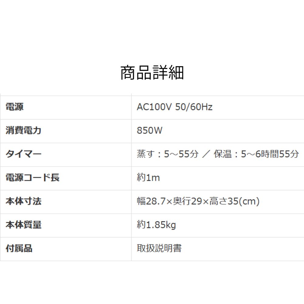 【商品詳細】 ■型式:SE-003 ■電源:AC100V 50/60Hz ■消費電力:850W ■タイマー:蒸す 5〜55分 / 保温 5〜6時間55分 ■電源コード長:約1m ■寸法:幅28.7×奥行29×高さ35(cm) ■質量:約1.85kg ■付属品:取扱説明書