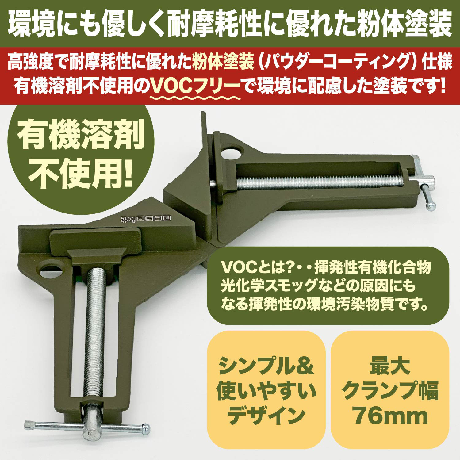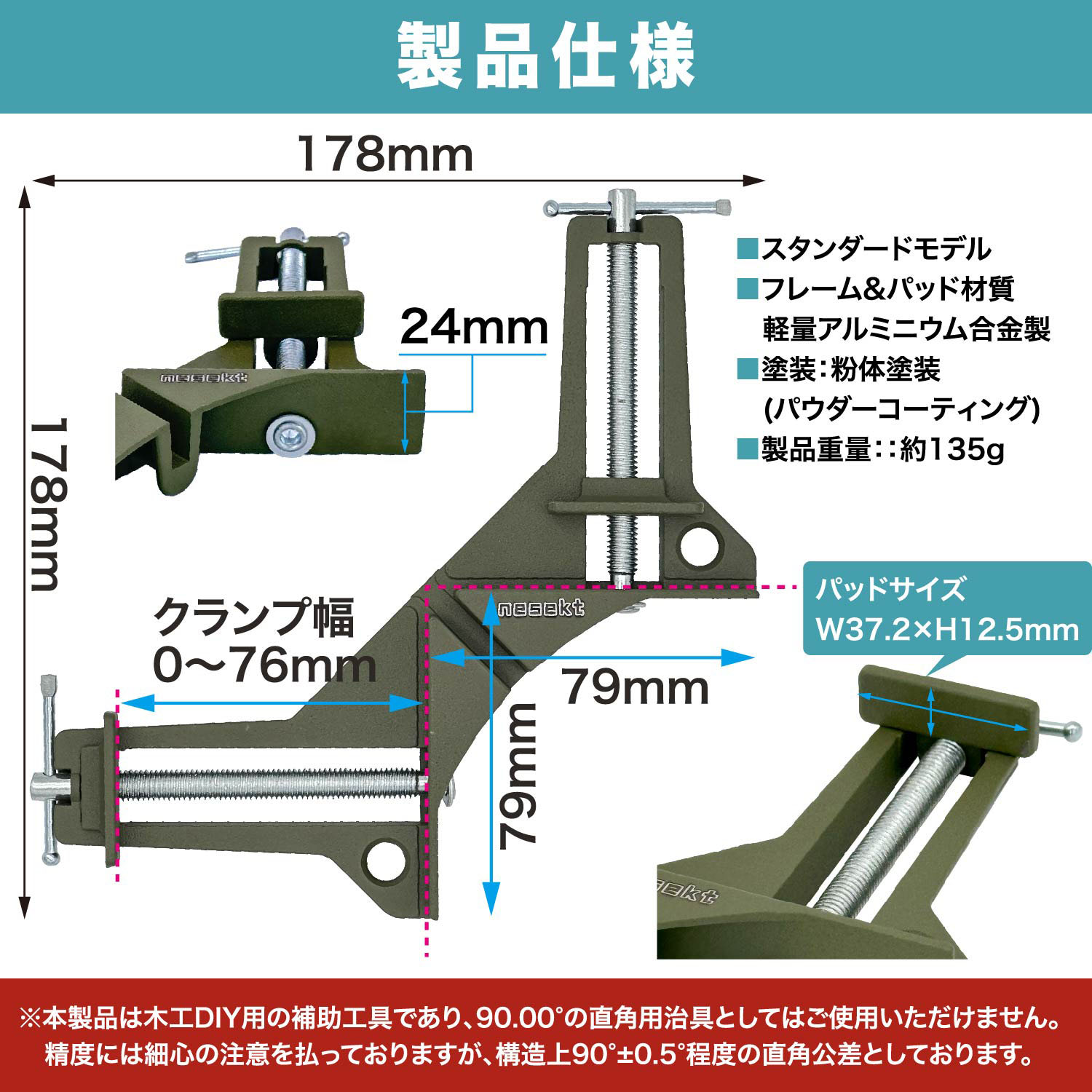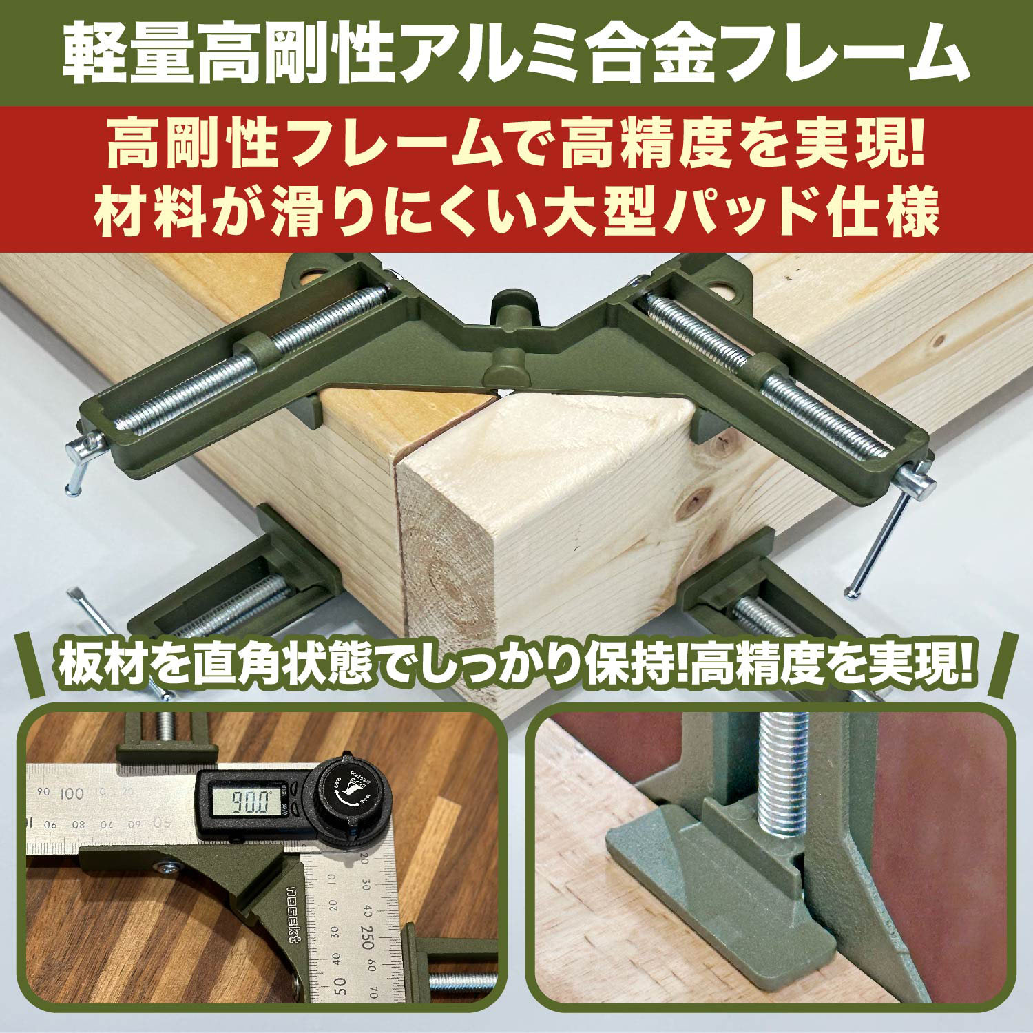 【高精度!材料同士を直角に固定できる】コーナークランプを使用することで木工作などにおいて材料同士を90度に固定することができます。直角の精度も高く、デジタルスケールの計測でも誤差は1度未満!高精度な仕上がりを求める方には必須の商品です。
