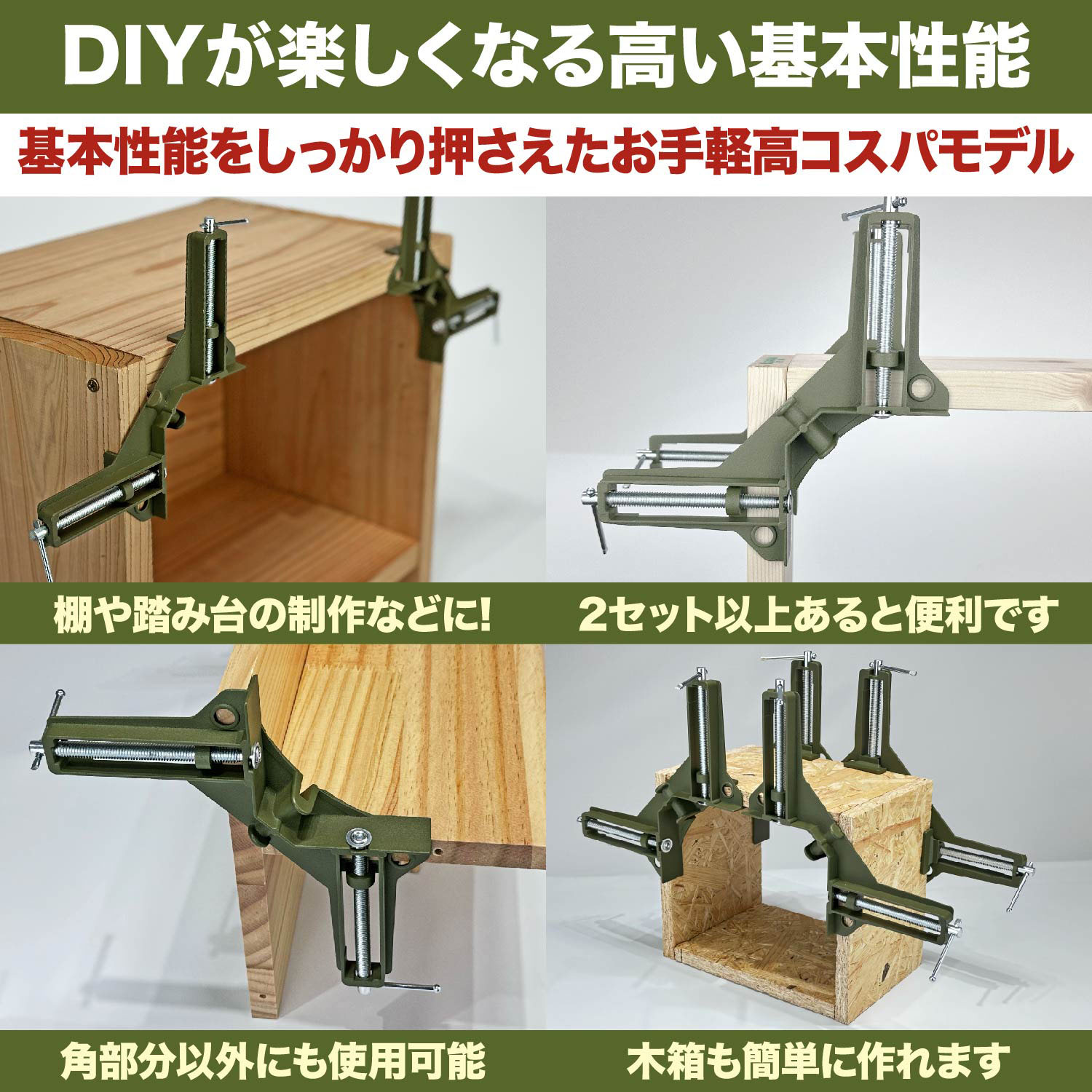 【高精度!材料同士を直角に固定できる】コーナークランプを使用することで木工作などにおいて材料同士を90度に固定することができます。