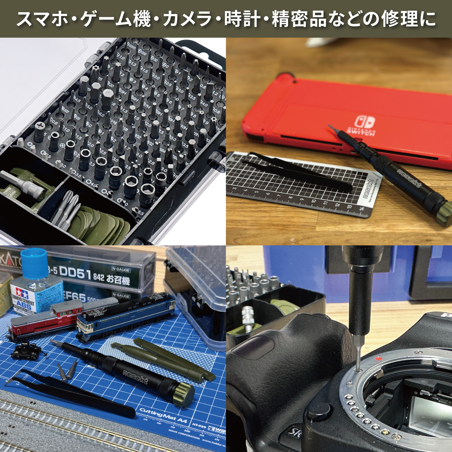 スマートフォンなどの修理やメンテナンスにも対応したディスプレイ脱着に便利な吸盤やプラスチック製のピックやヘラ、SIM用ピンなどの専用ツールもセットしました。また小さなネジや部品をつかみやすいピンセットはもちろん、小型のスパナやマグネットビットなど豊富なアクセサリーも付属しています。