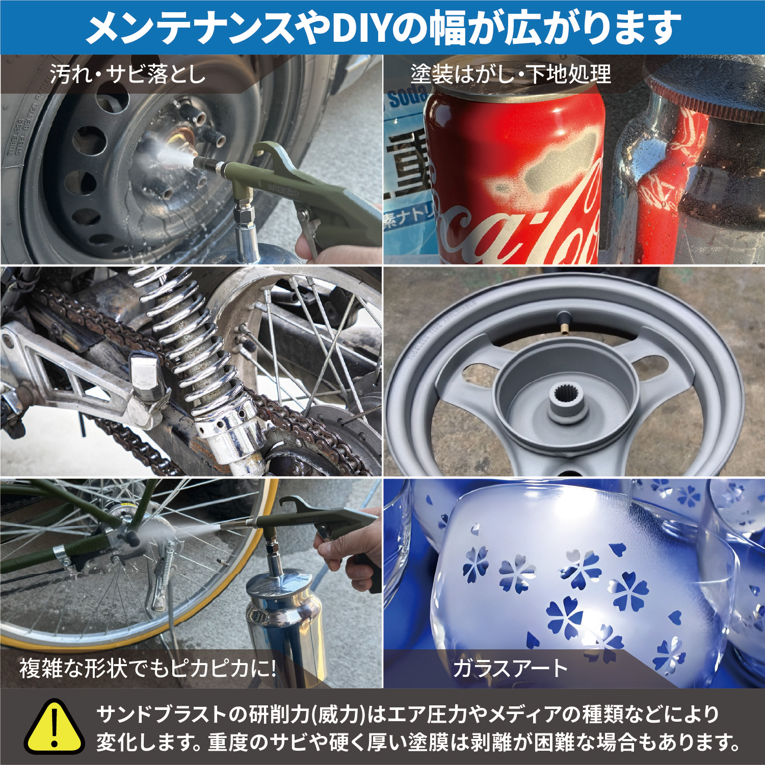 【基本性能を高めたサンドブラスター下カップ式】製品は錆取りや塗装剥がし、下地処理、鋳物や陶磁器、ガラス類などへ装飾にも多様されています。
