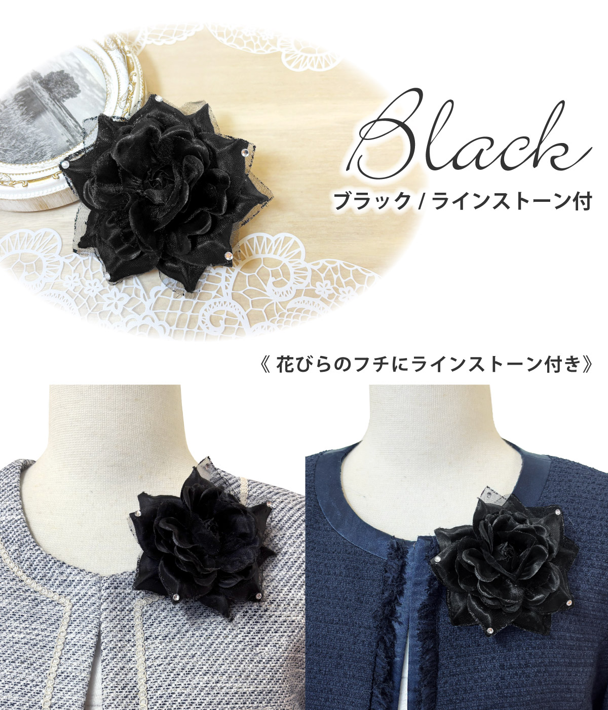 特別な日の装いにぴったり定番カラーも、ドレスやパーティー向きの差し色カラーも幅広く揃いました。 裏面は安全ピンとくちばし状のヘアクリップ付きです。
