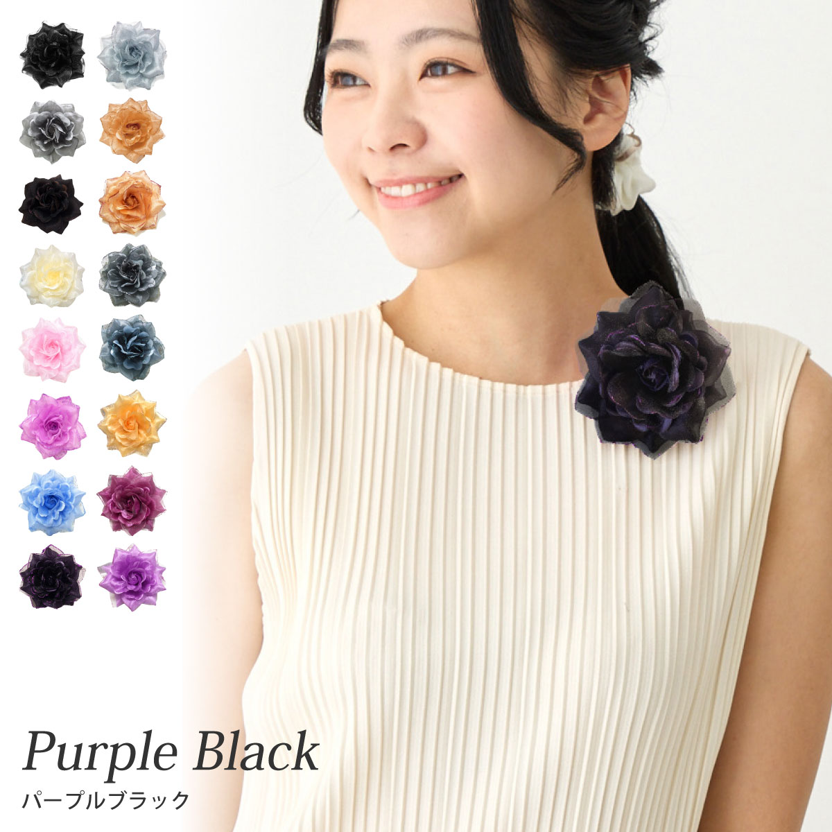 特別な日の装いにぴったり定番カラーも、ドレスやパーティー向きの差し色カラーも幅広く揃いました。 裏面は安全ピンとくちばし状のヘアクリップ付きです。