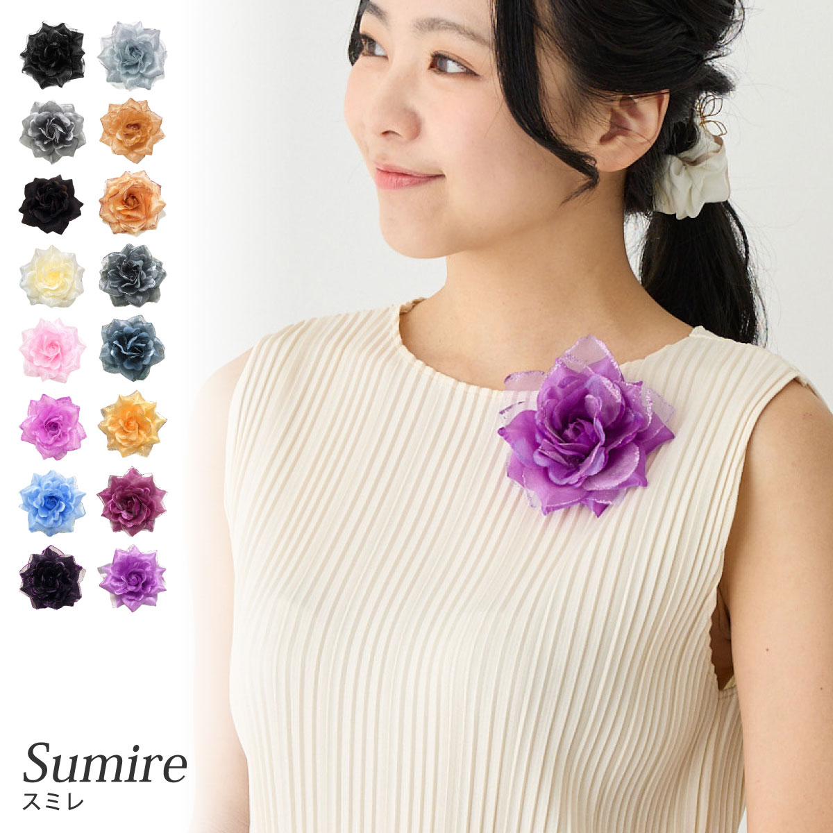 特別な日の装いにぴったり定番カラーも、ドレスやパーティー向きの差し色カラーも幅広く揃いました。 裏面は安全ピンとくちばし状のヘアクリップ付きです。